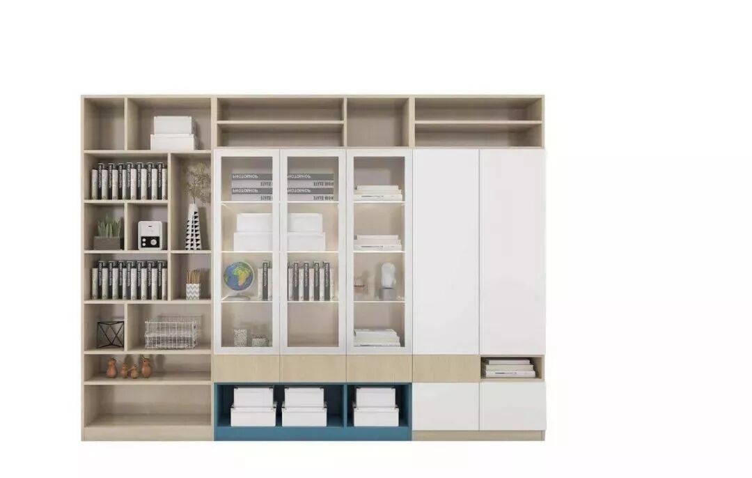 对于杂物多,又想保存书籍的家庭来说,闭门不容易沾灰,但是在不通风的情况下特别容易长书虫,书籍时长短,可以选择掩门玻璃+半开放设计书柜。