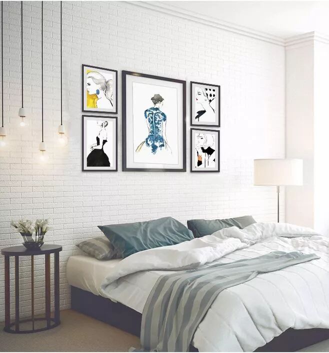 这是最简单的一种设计方式,婚纱照或者其他挂画不同规格地简单组合一下,就很有新意。