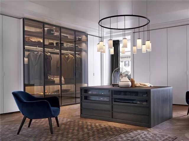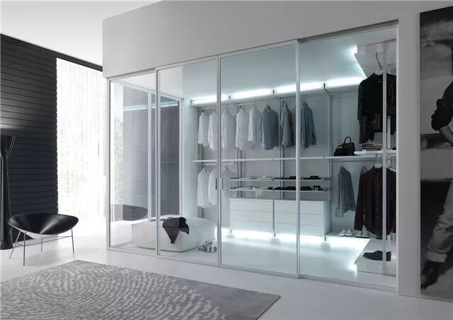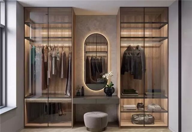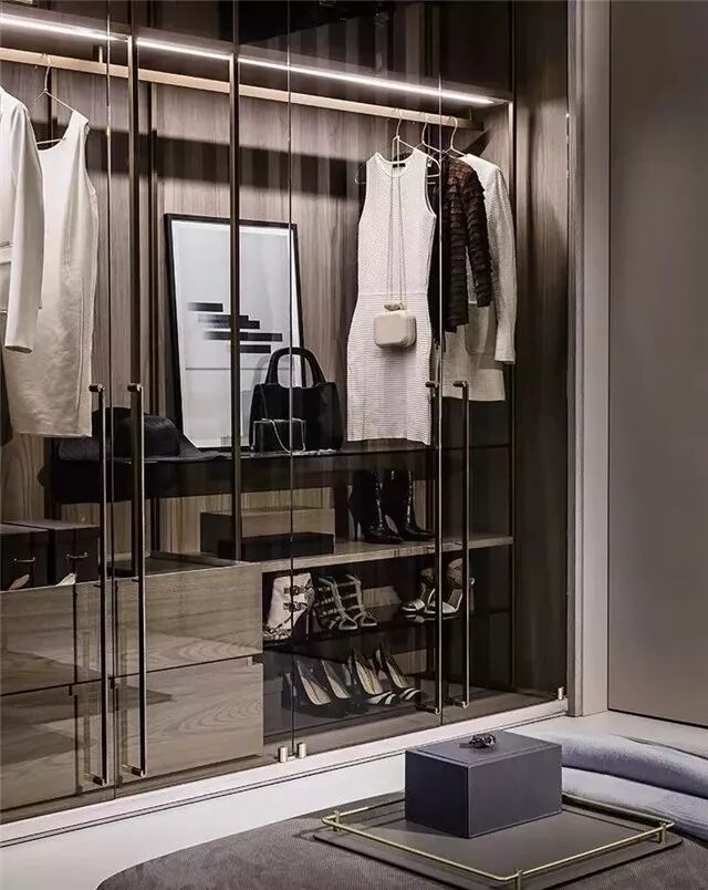如果说“透明”衣柜有点过于新奇,那我们就先从最常见的玻璃衣柜说起。早在几年前,市场上就流行起了玻璃门衣柜。不论是全玻璃门还是玻璃与木材混搭,这种衣柜都具有极强的现代感,受到很多年轻人喜爱。