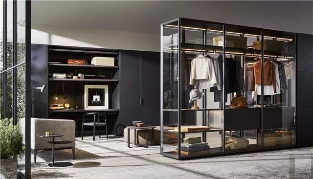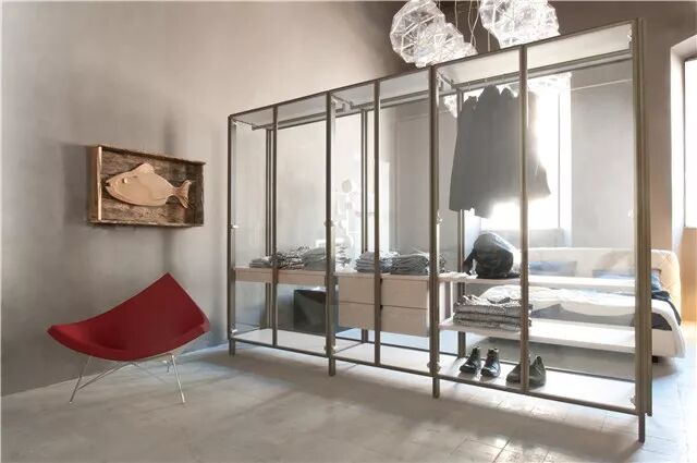 此外,更有设计师将整个柜体变“透明”。金属与玻璃的组合,既现代简约,又有一丝轻奢风格的调调。它甚至可以用来充当隔断,隔而不断,通透美观。