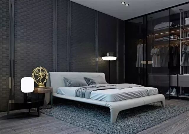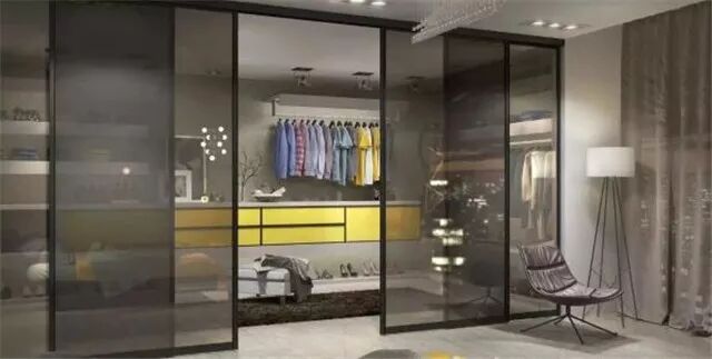 有色玻璃也很适合用在衣柜设计之中。它们多采用黑色、深褐色等深色玻璃,放在居室当中非常有质感。