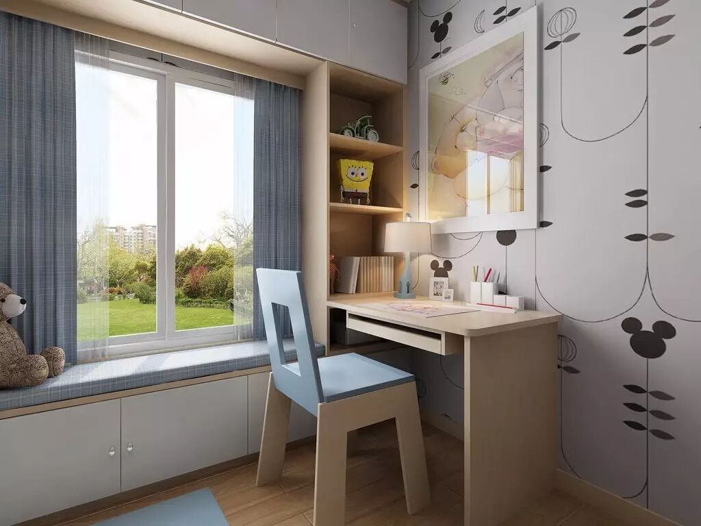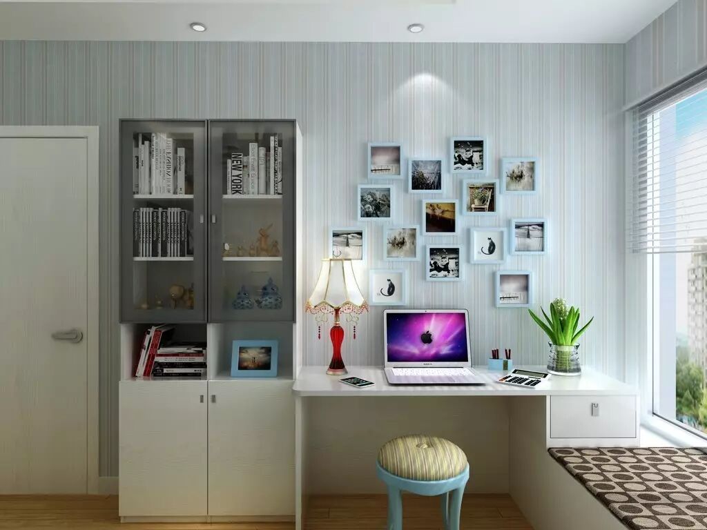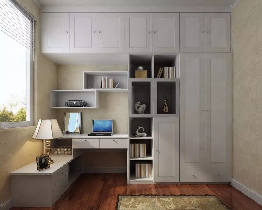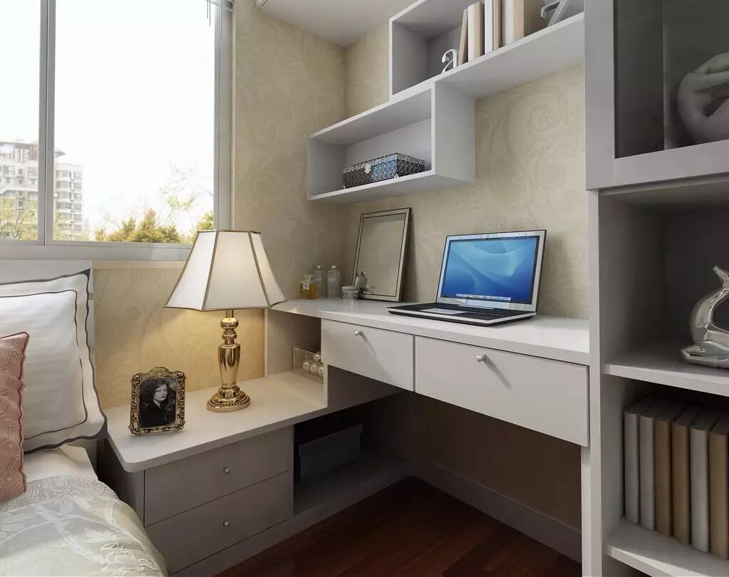 大部分人家里不会布置单独的书房,很多家庭的卧室往往兼备着书房的作用,利用转角柜与书桌的组合设计可以拥有更多收纳空间,省去添置书架、收纳柜的钱。