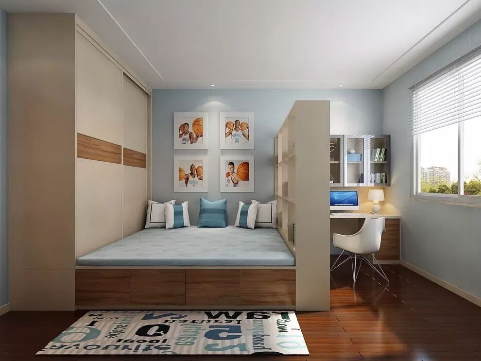 一个房间里既光线好,空间也大,主要在于卧室家具被精简成两大件:书桌与陈列柜的组合,床与收纳柜的组合,使得空间显得更加整洁,家具功能也齐全。