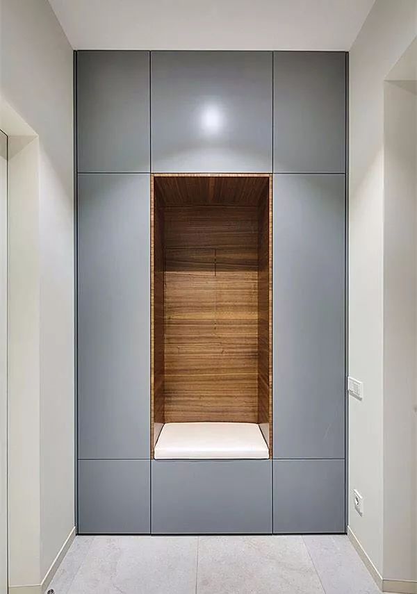 嵌入式壁柜是节省空间的利器,它的外观简约大气,内部收纳空间也很充足,你可以设计成半开放+半封闭的形式,让换鞋凳和收纳区融为一体,整个门厅就不会显得又挤又乱了。