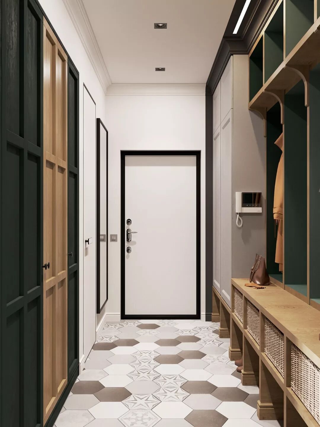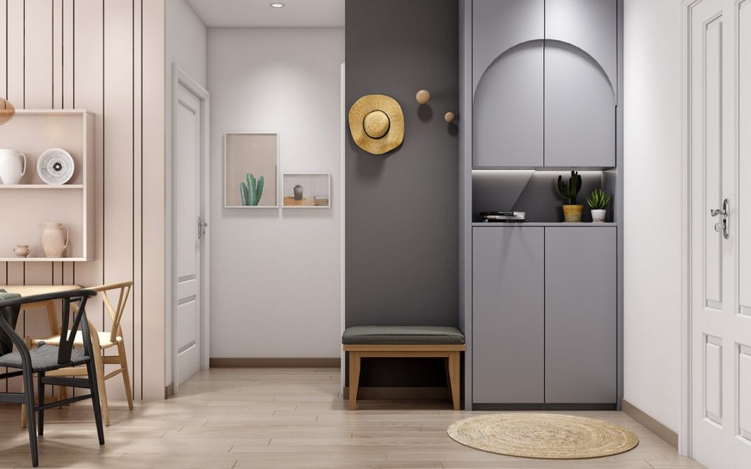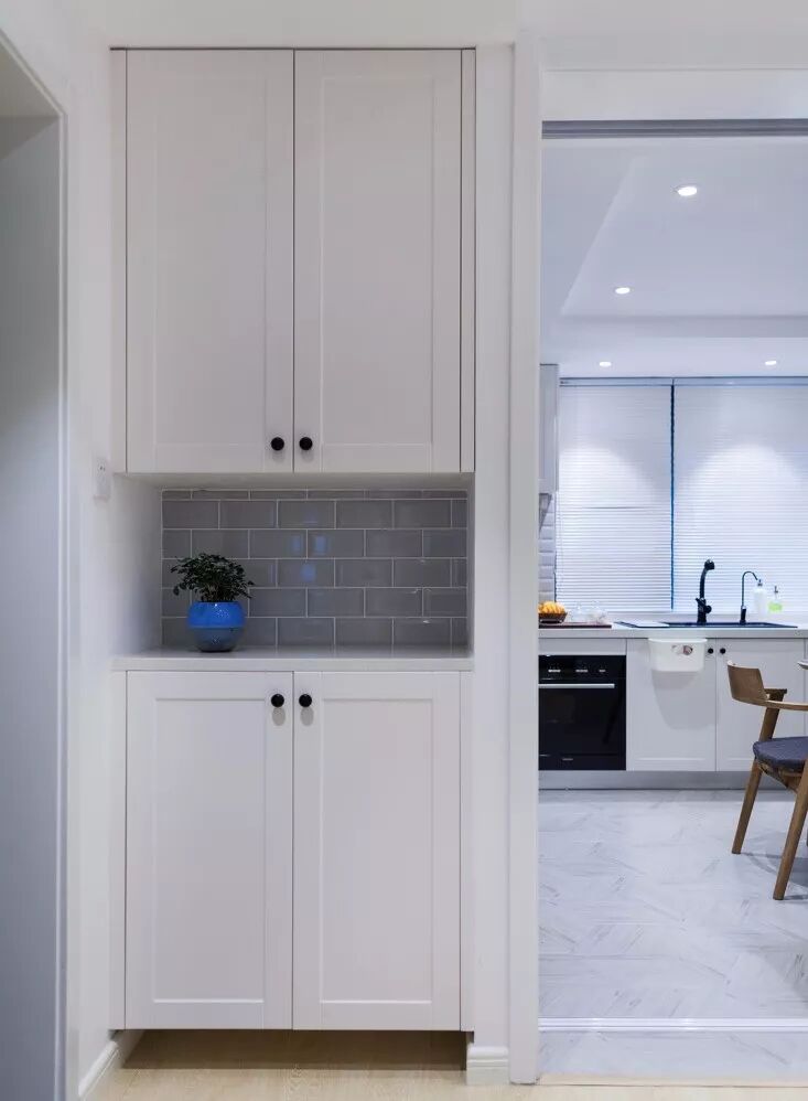 平行式鞋柜是空置中间和柜底悬空的设计,中间放绿植、相框、钥匙、零钱的,底部放常穿的鞋子,其他封闭起来的柜子都可以当做收纳柜。