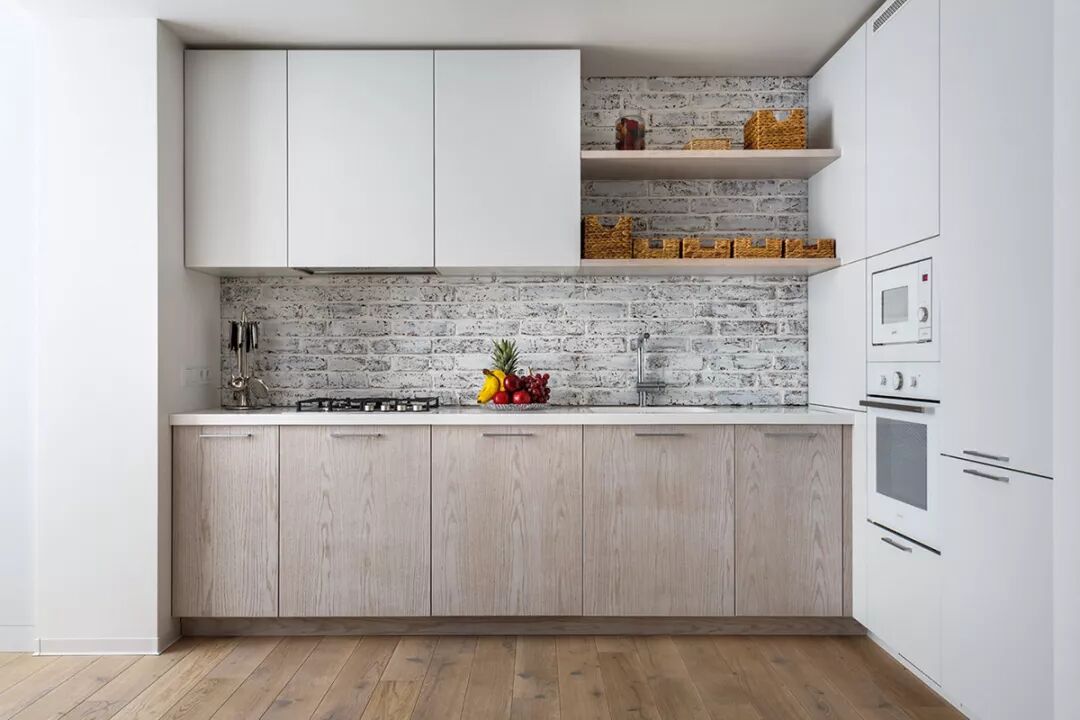 简洁的木质和白色厨房配有砖墙