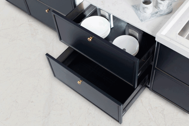 另外抽屉里也可以用一些内饰小工具,比如碗架和活动隔板,为抽屉内部空间划分出更细致的功能分区,让抽屉的空间发挥到更大,将所有餐具都规置得井井有条。