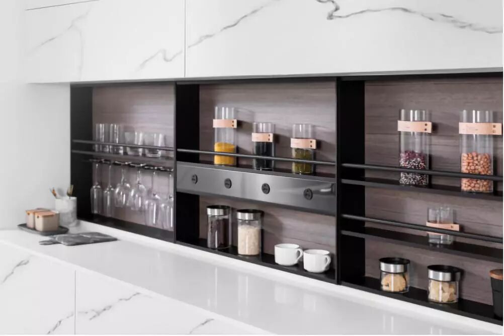 现在还有一个对于厨房的收纳经验是,能上墙的尽量都上墙。柏厨烤漆新品“礼白”的背墙收纳系统,利用墙面,解放台面,可以用来放酒杯、食材罐头、调味品等,巧妙增加了厨房的收纳空间。