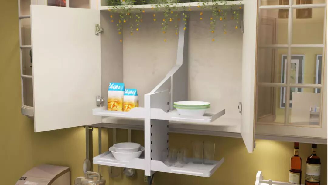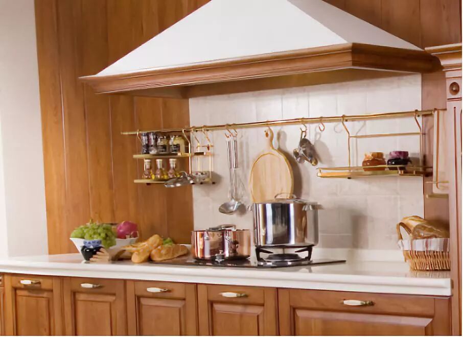 如果嫌弃吊柜太高不好拿东西,可以像柏厨实木系列“路易十六II”这样配一个吊柜升降架,拿取物品就方便多了,轻松解决了矮个子够不到的老大难问题。
