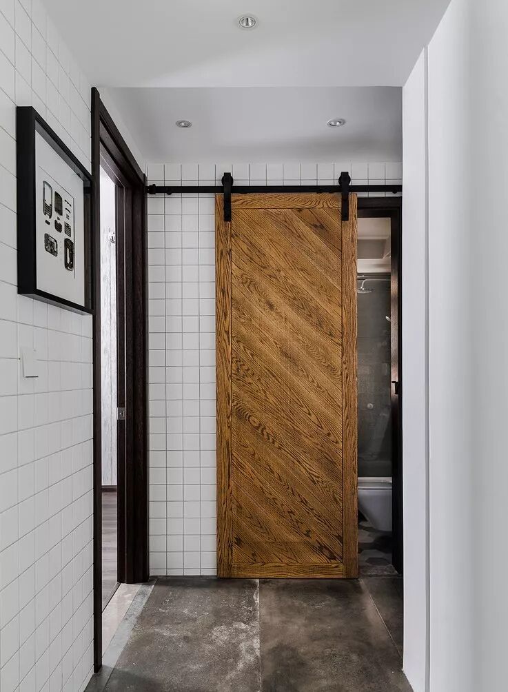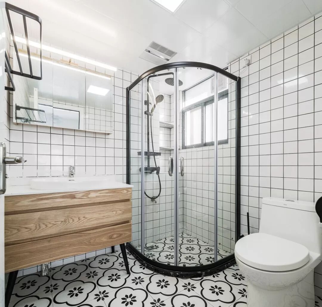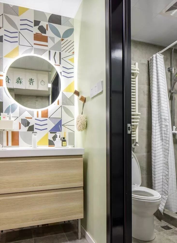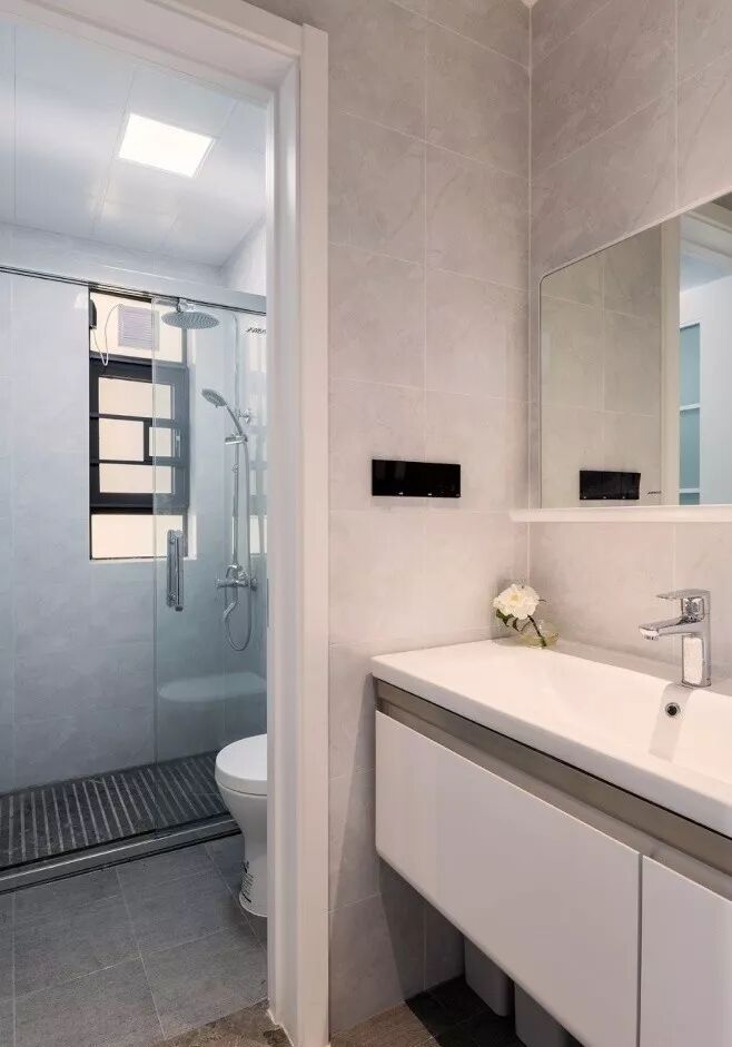 对于小卫生间来说,用常见的推开门就要占一大半的空间,如果换成折叠门或是推拉门,那么对着门口的位置还能放个洗手台或浴室柜。