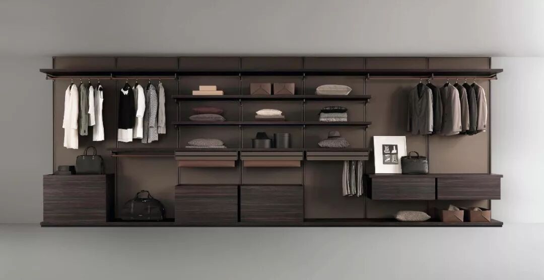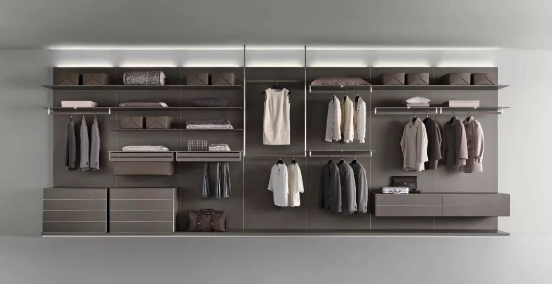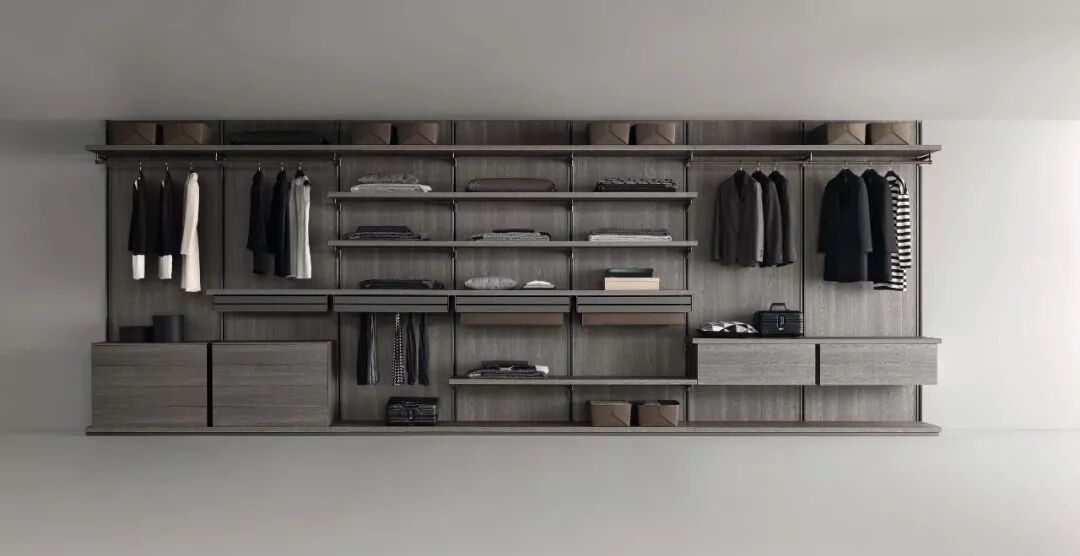 强大的挂墙系统,长短隔板的运用,分割出不同的空间,增加了衣柜的收纳功能。