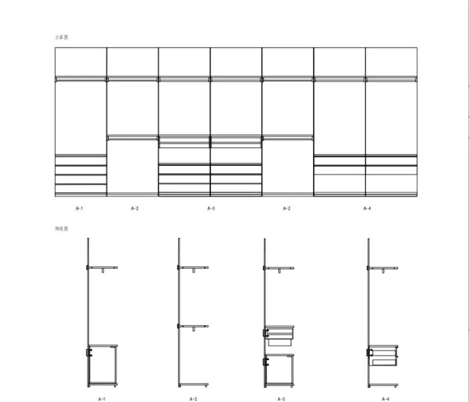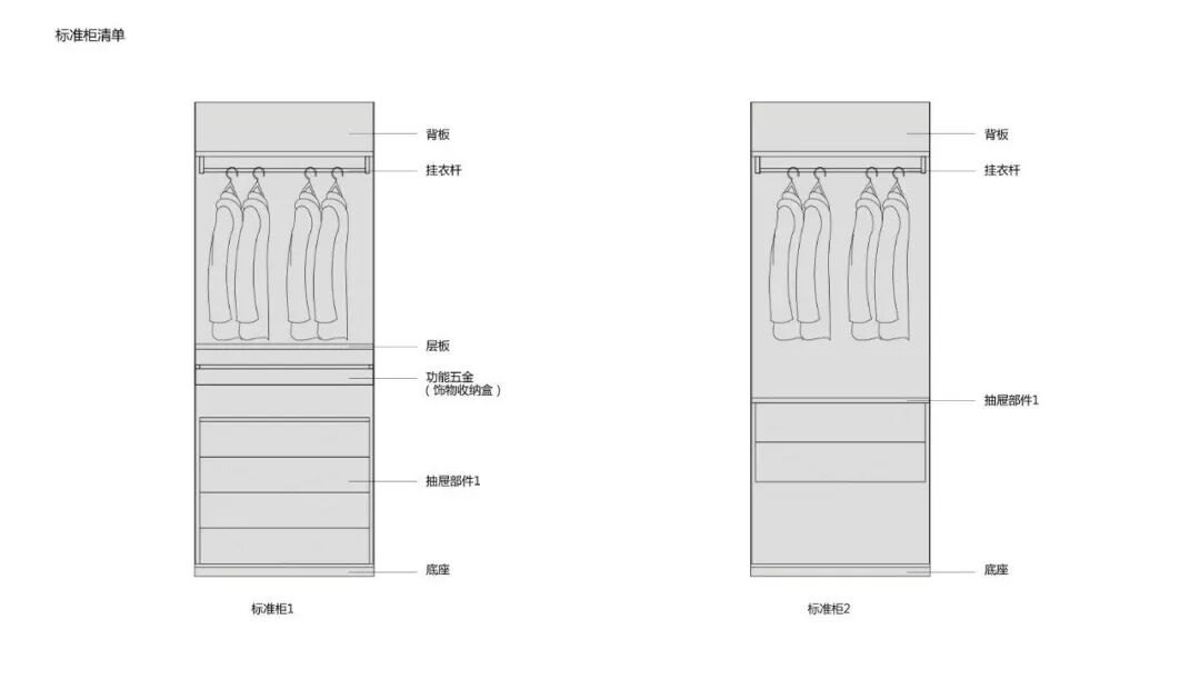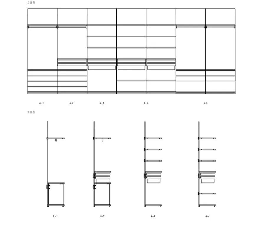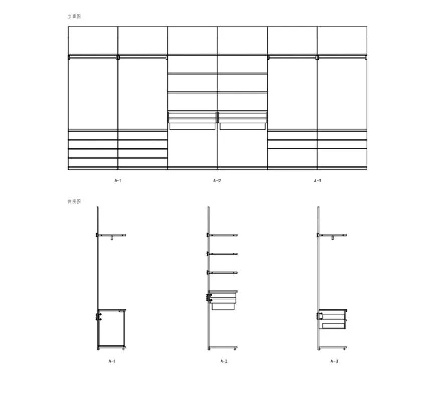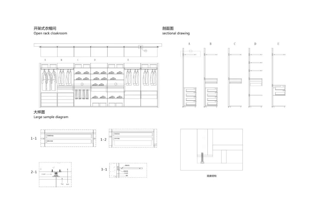 以一套衣帽间的平面图、立面图、剖面图、大样图以及标准柜清单、标准件清单为例,说明挂墙衣帽间的设计方法。