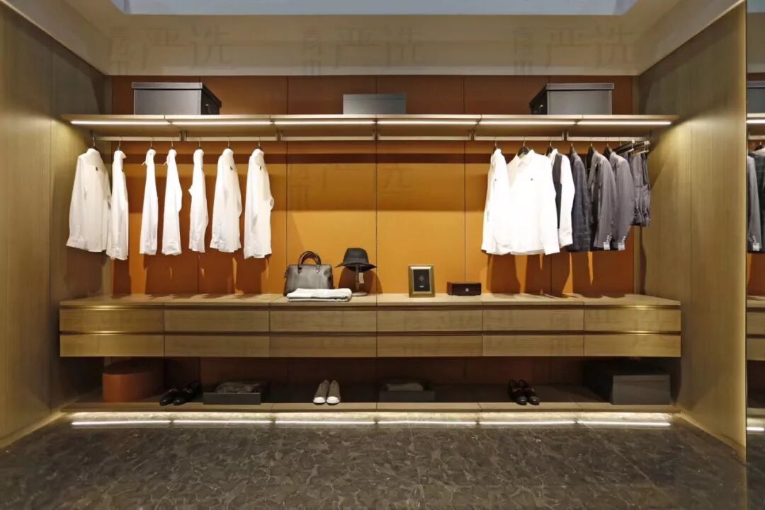 挂墙式衣帽间:是指通过敞开式布局,反传统的衣帽间设计,将五金系统、灯光系统和极具现代风格的墙板,演绎出既简约又典雅,既高贵又不庸俗的衣帽间设计。
