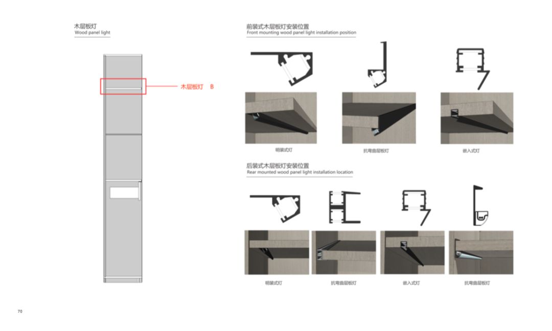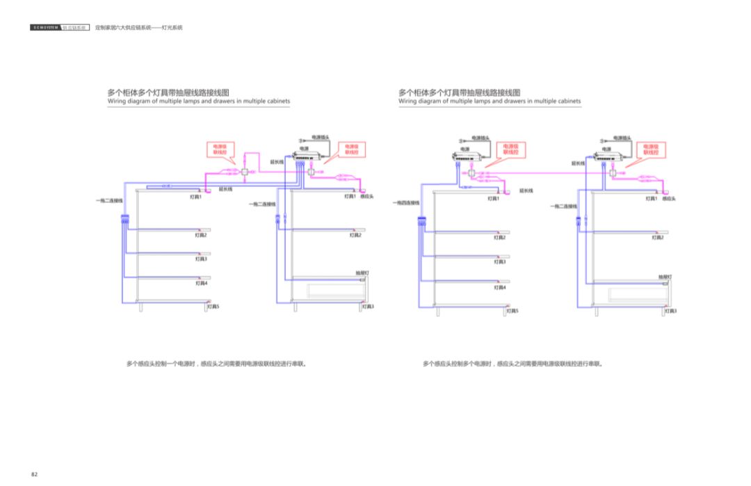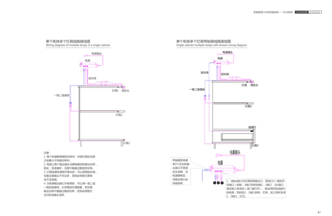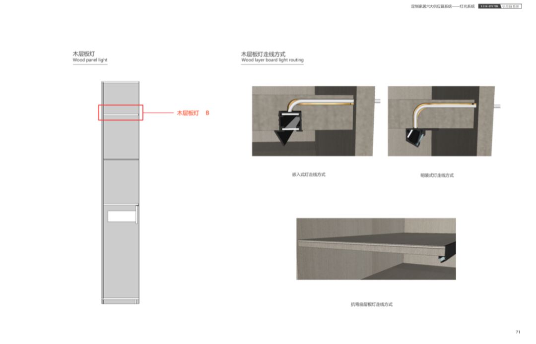灯光系统分为顶板灯、木层板灯、玻璃层板灯、抽屉灯和踢脚线灯,除此之外还需要有感应头、控制器、延长线、变压器、电源级联线控、隐线槽等,安装方式有前明装式、后明装式、前暗装式、后暗装式,走线方式有嵌入式灯走线和明装式灯走线,发光位置有两种,两面发光和三面发光,感应头有开关门感应开关、挥手感应开关、人体感应开关、单开门感应开关、双开门感应开关等,色温范围<3300k,为暖光光源,3300-5000k为中间光源,>5000K为清冷光源,企业可根据厂家的参数和自身需求设定色温值。