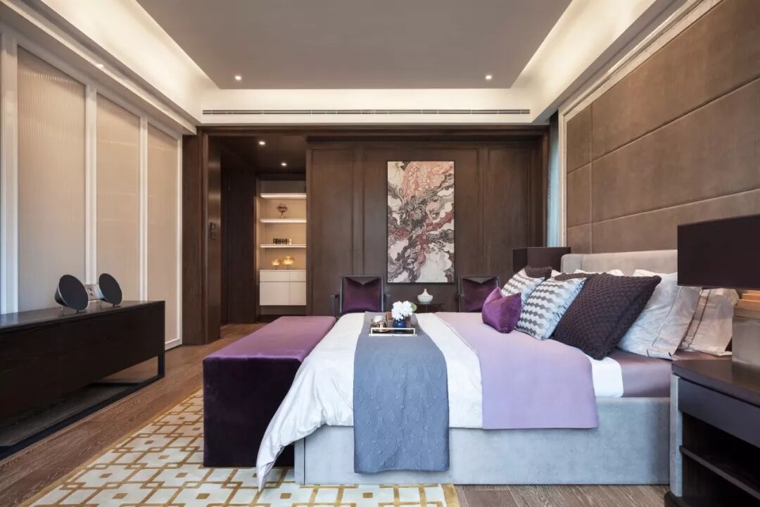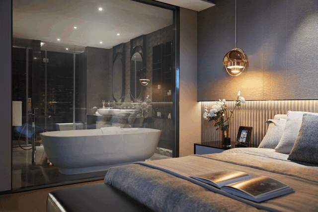 苏河湾行政公馆A3、A5户型以现代风格呈现都市快节奏生活,简约但不简单,开放性的客餐厅与厨房厨房有利于促进家人互动,私密性的卧室采用暖色调软装配色,更具温馨氛围。色彩运用自如是该空间的特色之一,使整个空间的生活品味和艺术化气息显著提高。