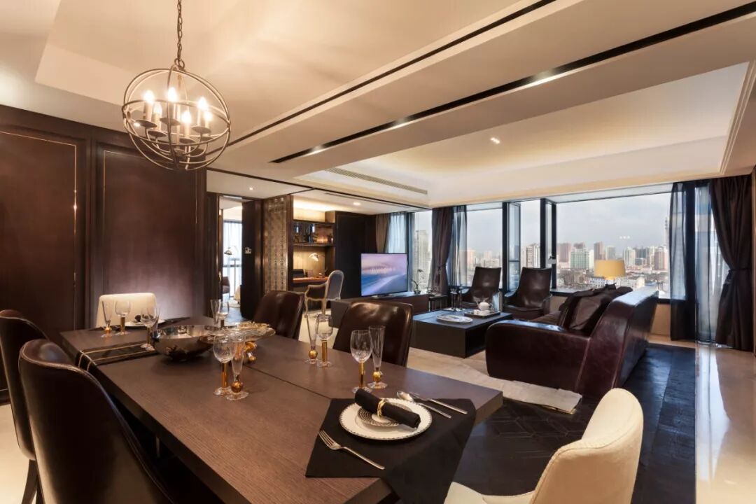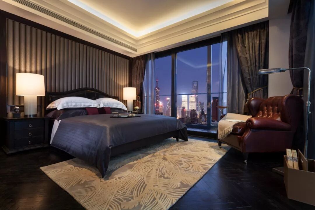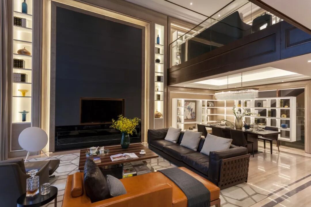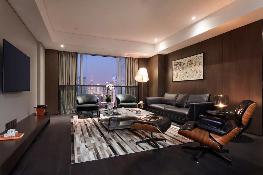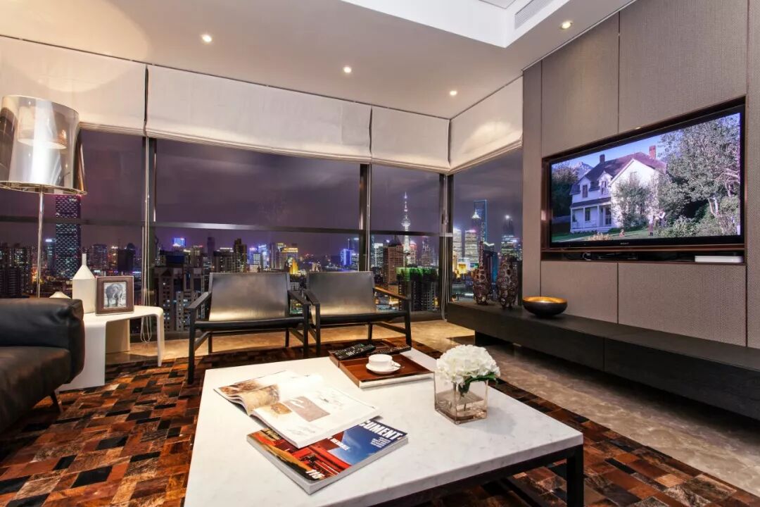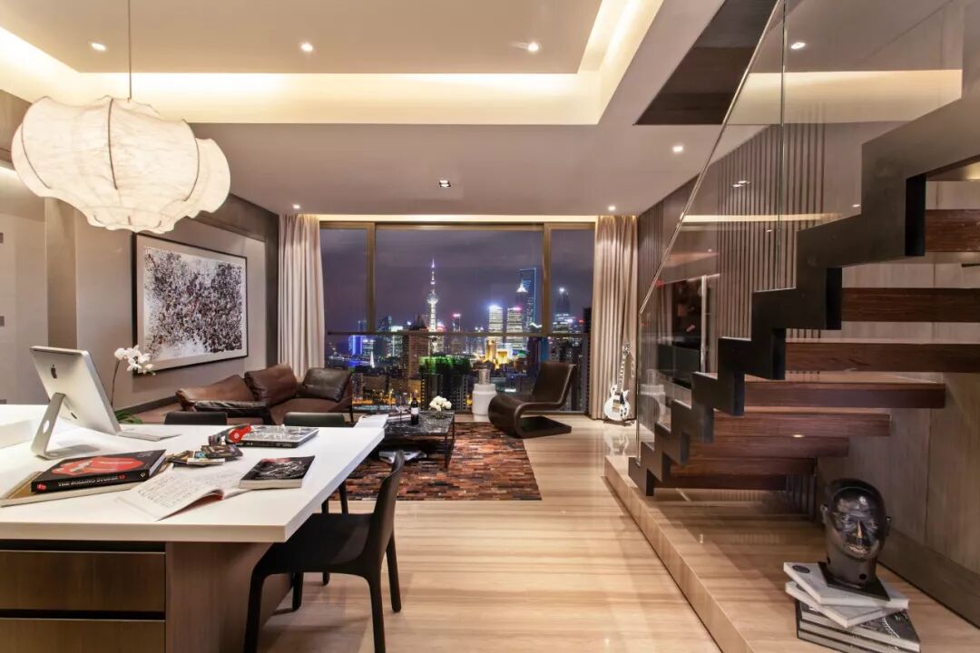 无论外面的露台,还是室内的吧台,餐厅、厨房、家庭厅、浴室都能看到外滩的景色。整体风格偏曼哈顿风,现代前卫又有优雅的艺术气质。在设计手法上汇集全球多元文化,展现出国际都会的梦幻色彩与超脱浮华的高雅气质。
