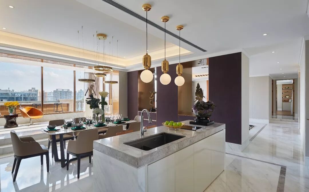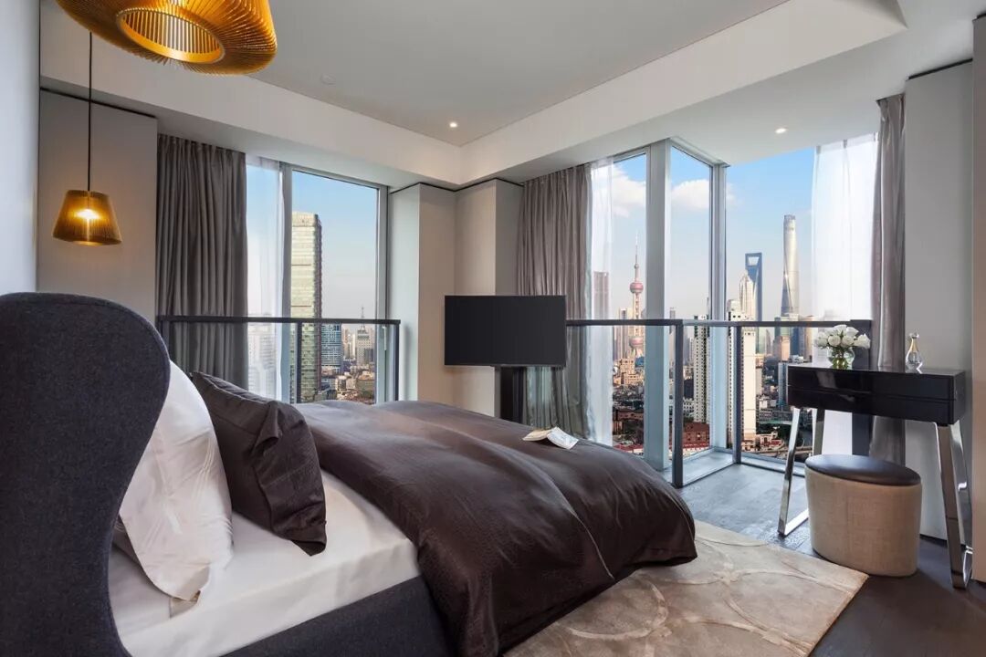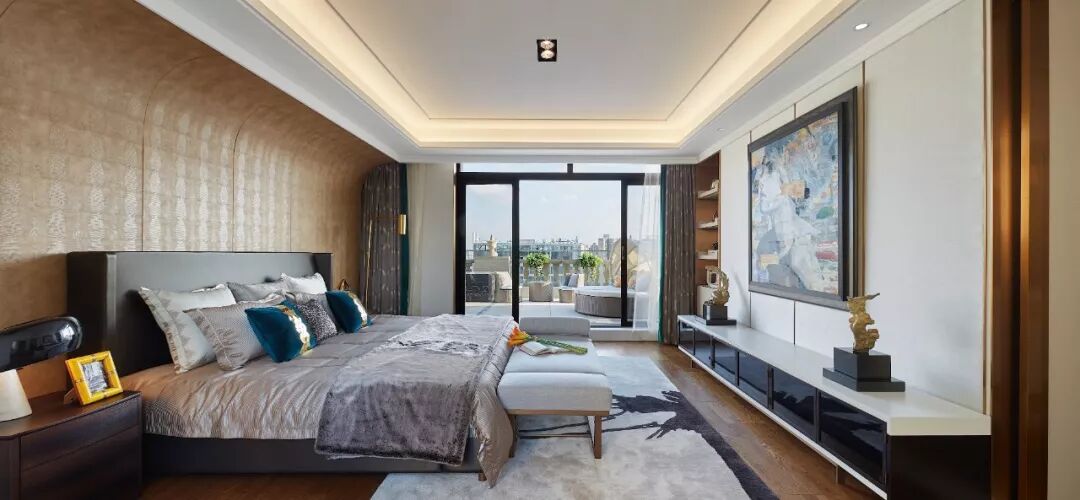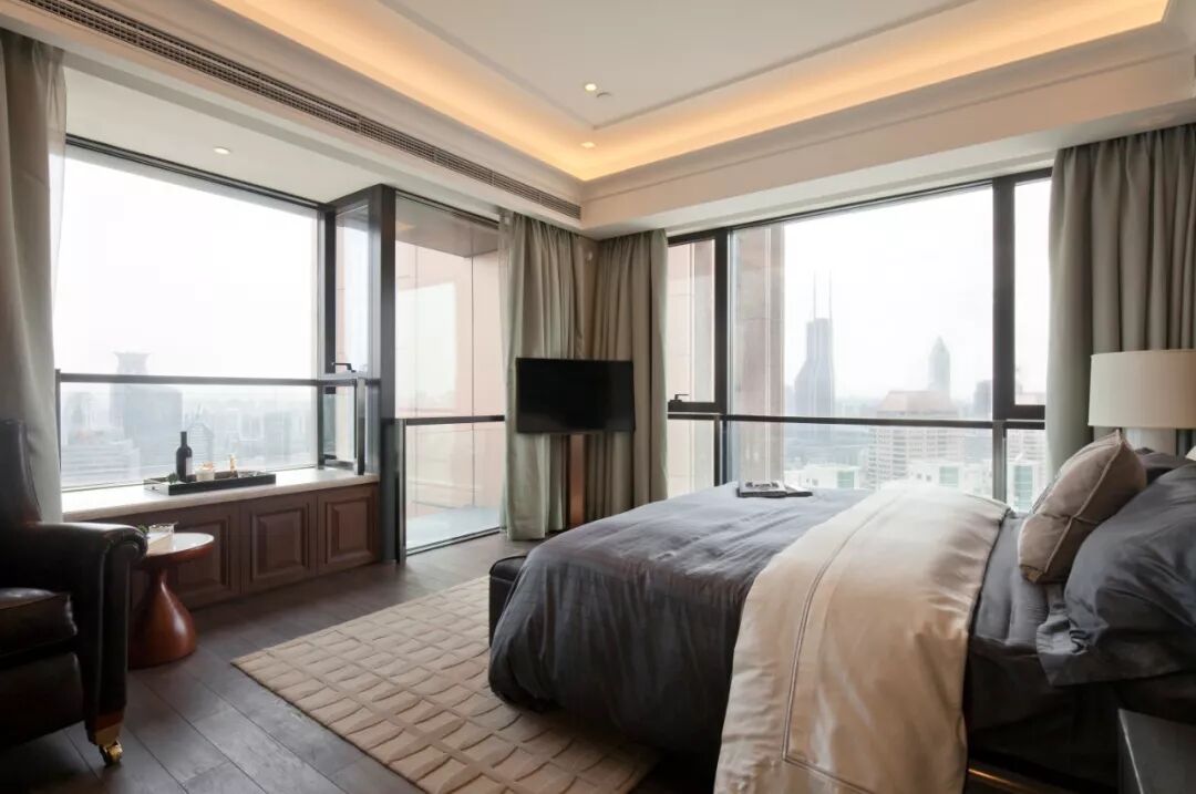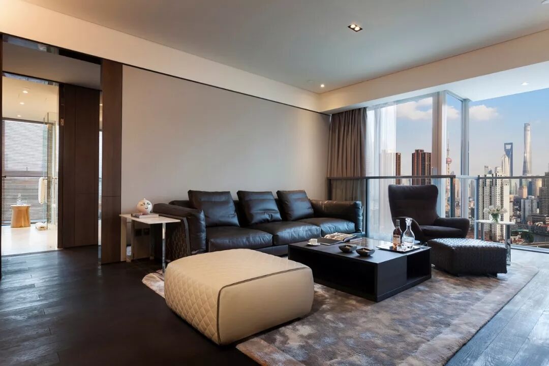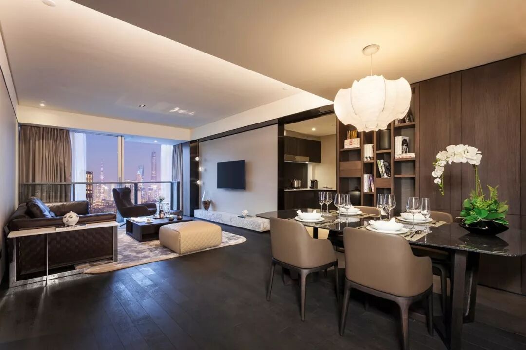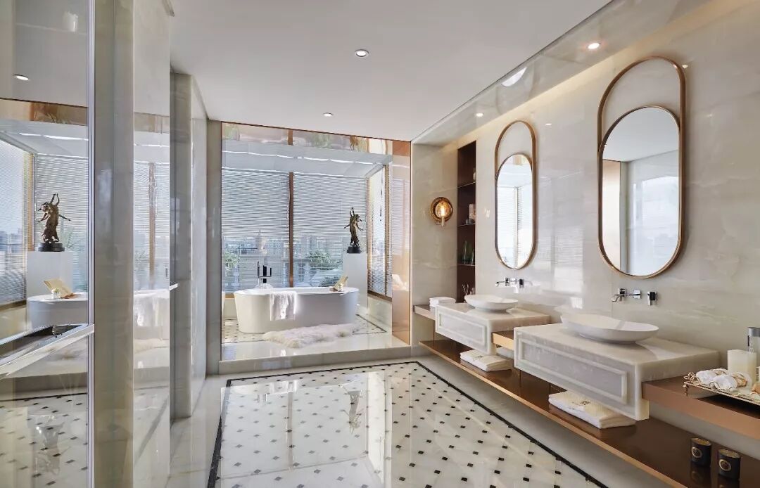 无论外面的露台,还是室内的吧台,餐厅、厨房、家庭厅、浴室都能看到外滩的景色。整体风格偏曼哈顿风,现代前卫又有优雅的艺术气质。在设计手法上汇集全球多元文化,展现出国际都会的梦幻色彩与超脱浮华的高雅气质。