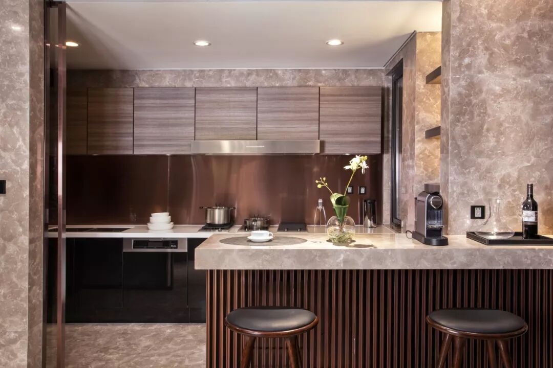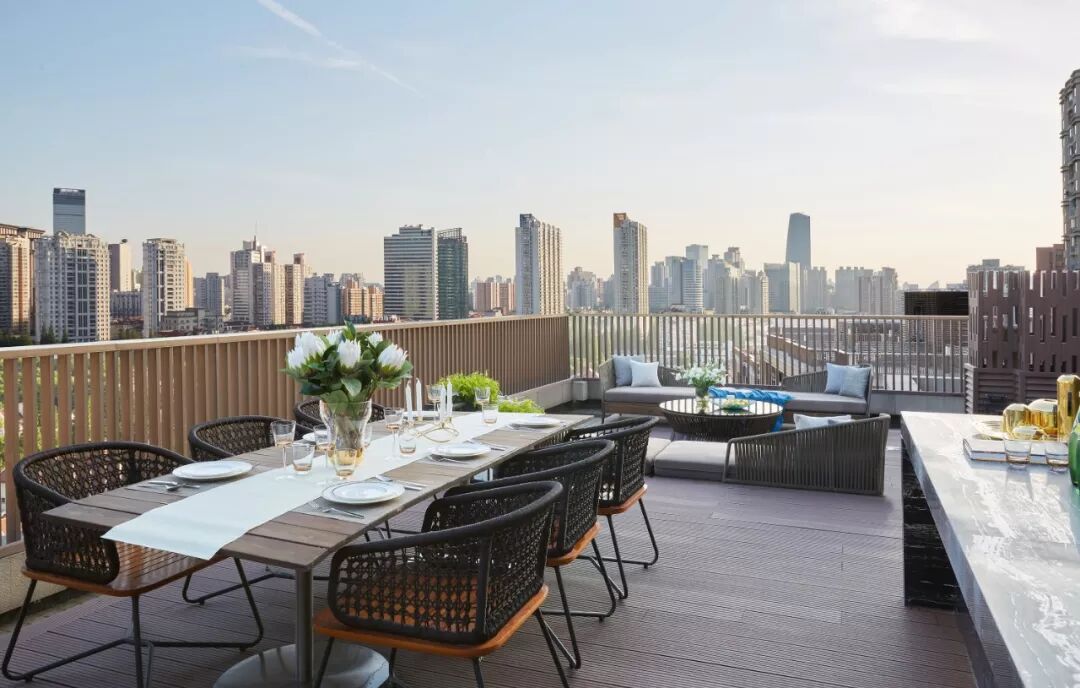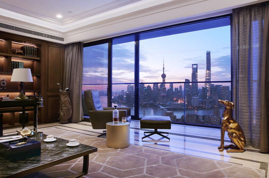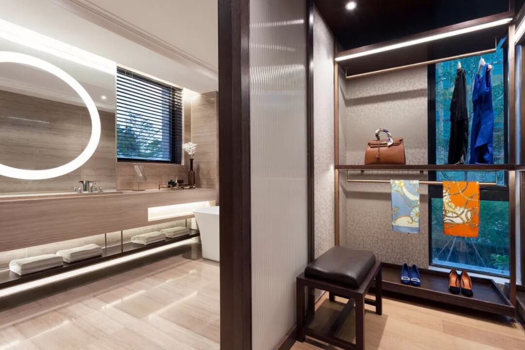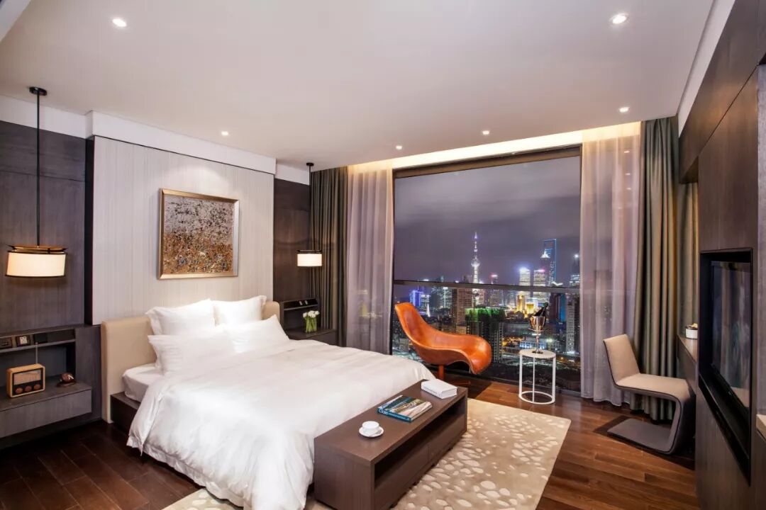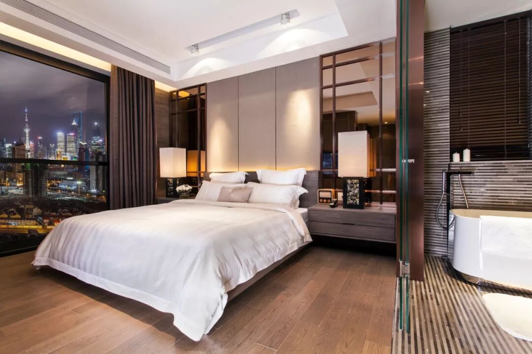 无论外面的露台,还是室内的吧台,餐厅、厨房、家庭厅、浴室都能看到外滩的景色。整体风格偏曼哈顿风,现代前卫又有优雅的艺术气质。在设计手法上汇集全球多元文化,展现出国际都会的梦幻色彩与超脱浮华的高雅气质。