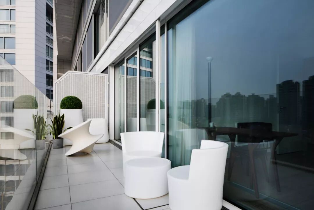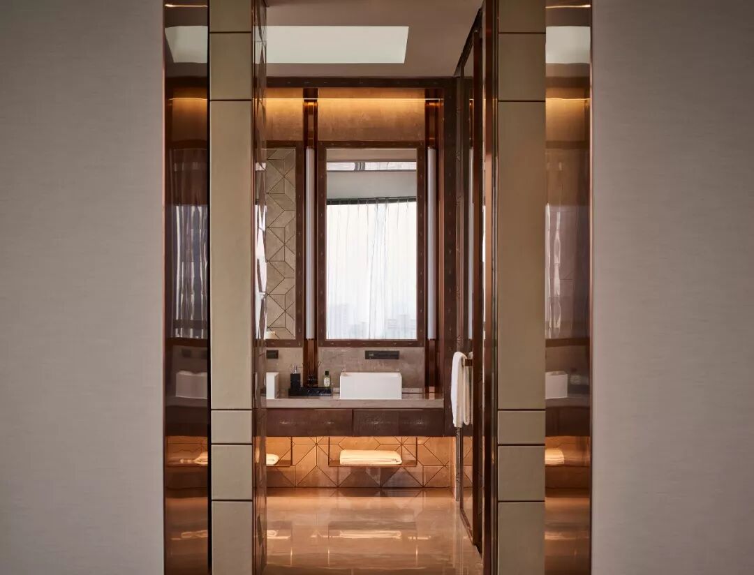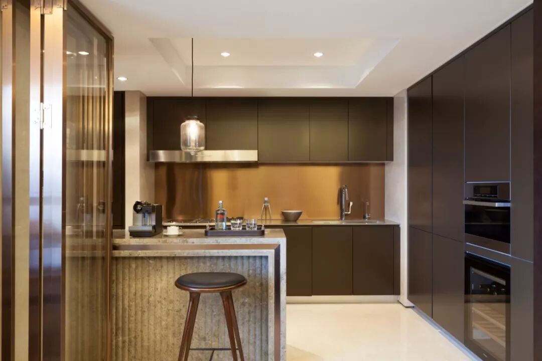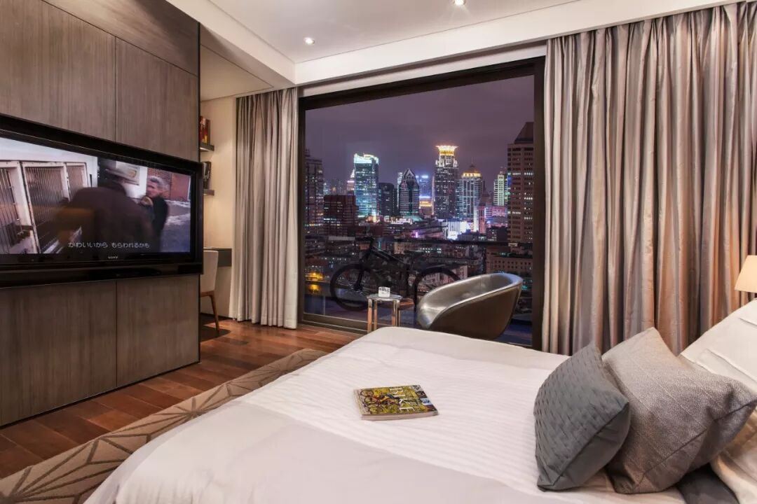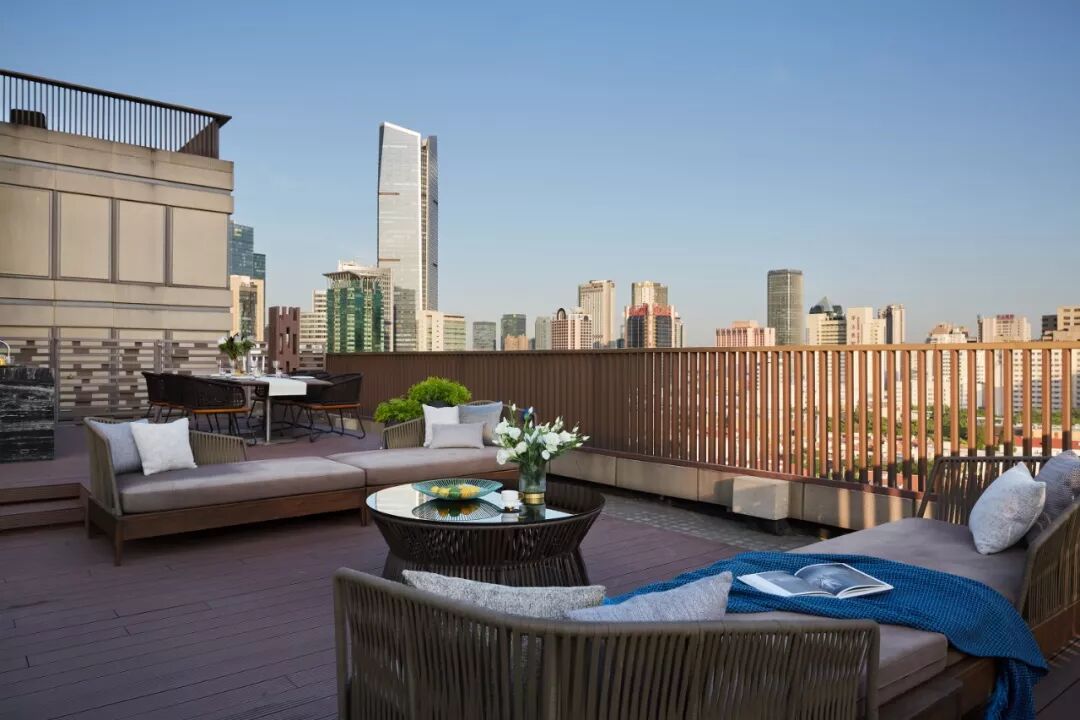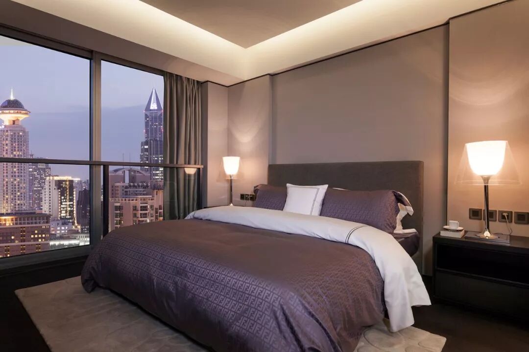 无论外面的露台,还是室内的吧台,餐厅、厨房、家庭厅、浴室都能看到外滩的景色。整体风格偏曼哈顿风,现代前卫又有优雅的艺术气质。在设计手法上汇集全球多元文化,展现出国际都会的梦幻色彩与超脱浮华的高雅气质。