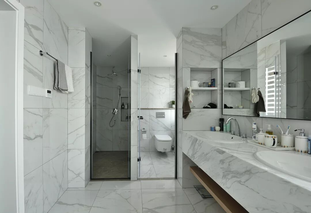 ▲主人卫生间整体墙地面是白色的大理石,双人洗手盆也是大理石质感,整体简洁优雅的空间,充满了优雅端庄的质感。