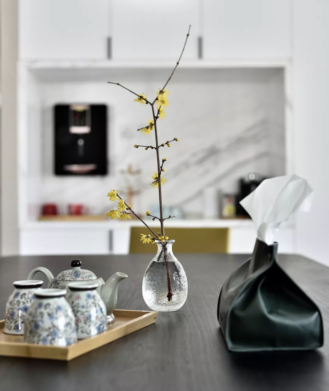 ▲餐桌上的餐具与茶壶,还有一个玻璃花瓶,与独特的抽纸盒,使得空间显得更有活力档次。
