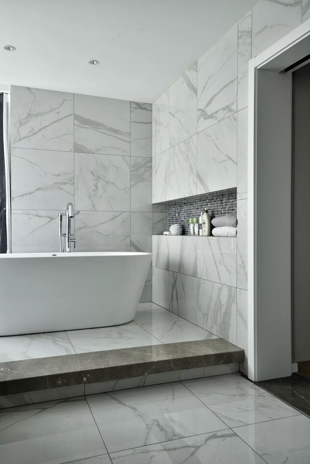 ▲浴缸地面整体抬高,抬高下方的位置还做了灯带,让空间显得层次又有温馨感。