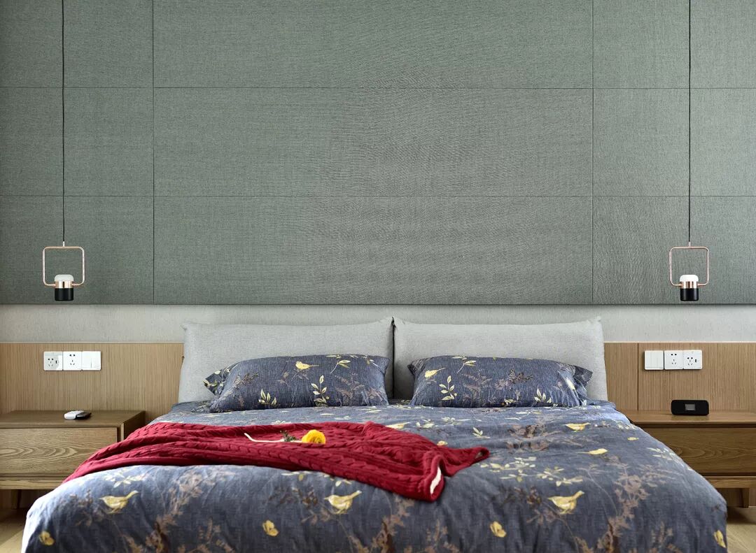 ▲床头墙统一以灰绿色的硬包,墙脚与地板保持一致的木色,两侧木质的床头柜上方安放加入吊灯,蓝红配的床单点缀,显得格外的端庄素雅。