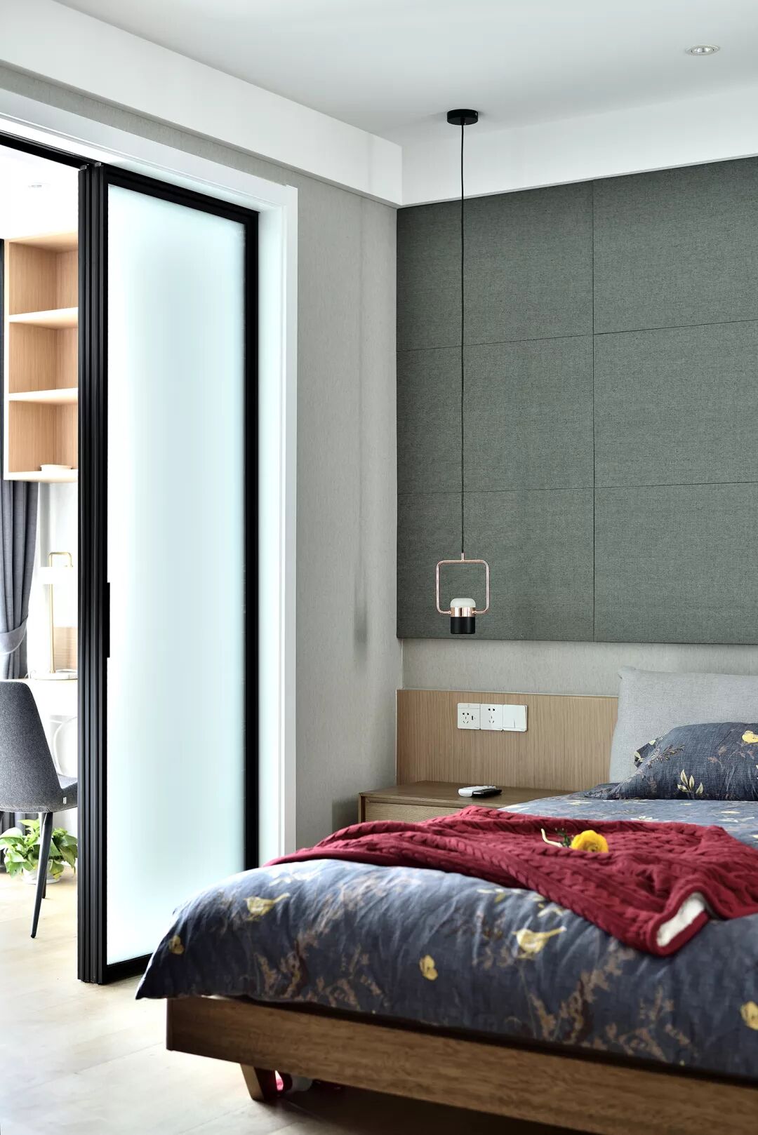 ▲次卧借助飘窗做了个书桌,灰色墙面、蓝色床单与绿色窗帘,素雅的纯色搭配,带来的是端庄优雅的氛围。