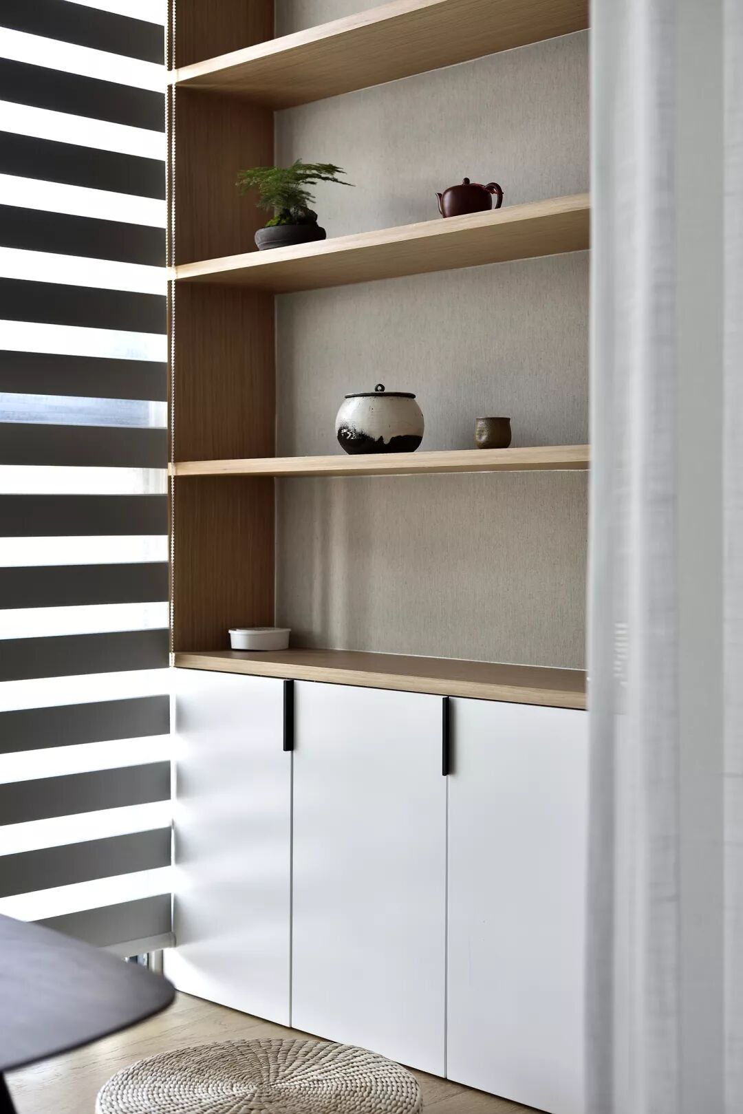 ▲阳台侧边做成地柜+上层搁板展示架,摆上简单禅意的装饰,还有一张小茶台,让生活处处都是悠闲的自在。