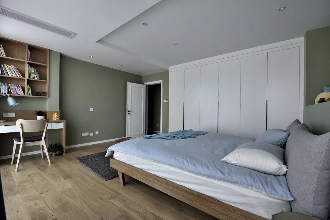▲素雅的绿色墙面基础,一侧墙面装入大面积的衣柜,床尾是一张书桌,为孩子提供了个读书写作业的舒适空间。