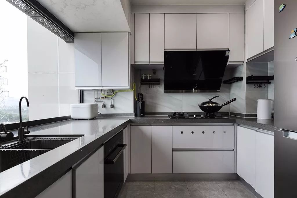 ▲厨房挨着大面积的窗户,整体白色的橱柜吊柜,在U形的操作台下,为主人提供了一个舒适优雅的做饭体验。