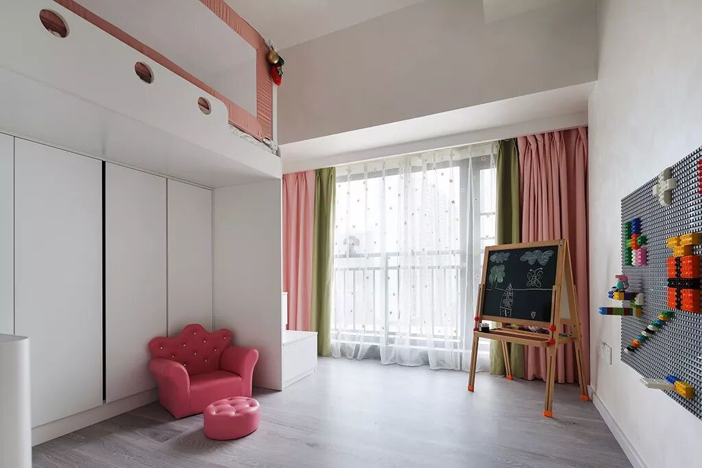 ▲儿童房上铺是床,床下是衣柜与休息空间,摆上一张粉色的儿童沙发,窗户粉色+绿色的搭配,整体显得浪漫而又童趣。