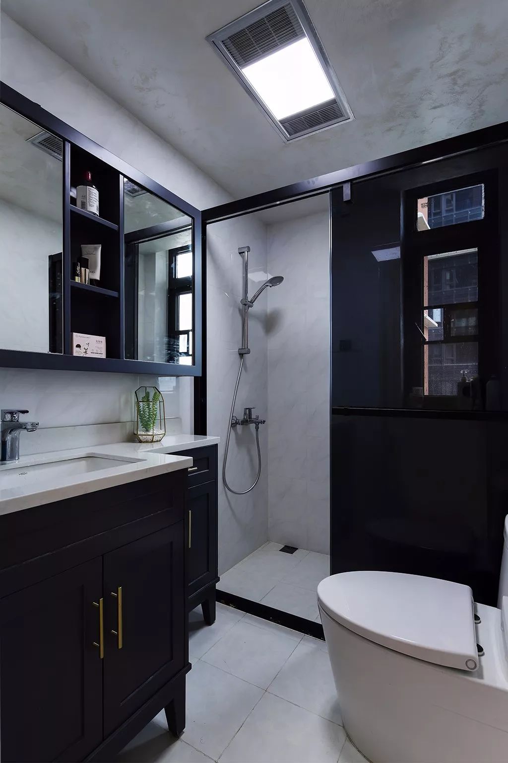 ▲卫生间在简洁的墙面地砖基础,搭配深黑色的洗手盆与淋浴房推门,呈现出一个稳重舒适的卫浴空间。