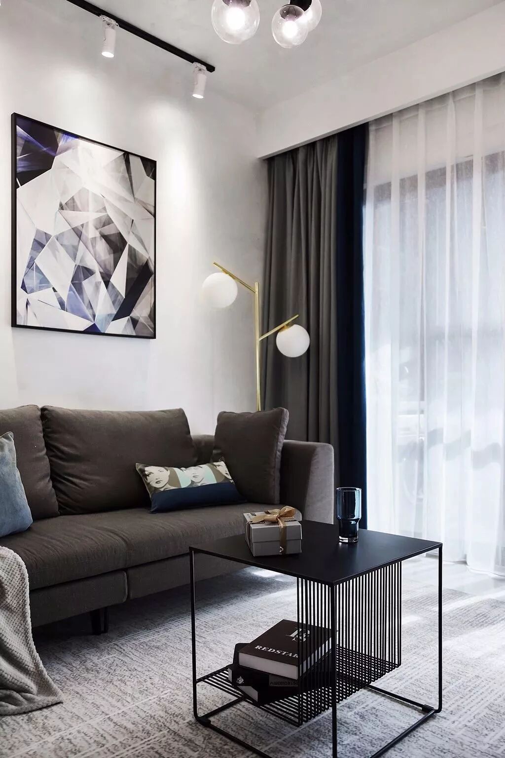 ▲沙发墙的一幅几何图案装饰画,角落还有一盏黄铜质感的球形落地灯,客厅中间的这个黑色铁艺架茶几,整体呈现出一个端庄沉稳的气质。