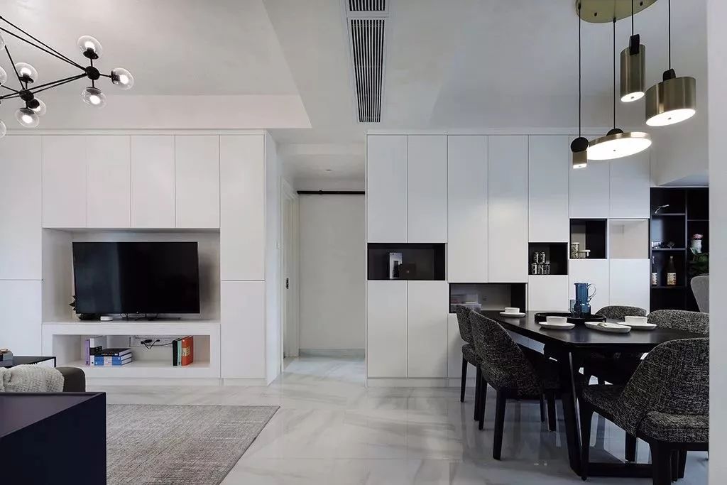 ▲客厅与餐厅隔着过道,客厅区域的顶部留空,餐厅整体吊平的天花显得更加简洁的空间。