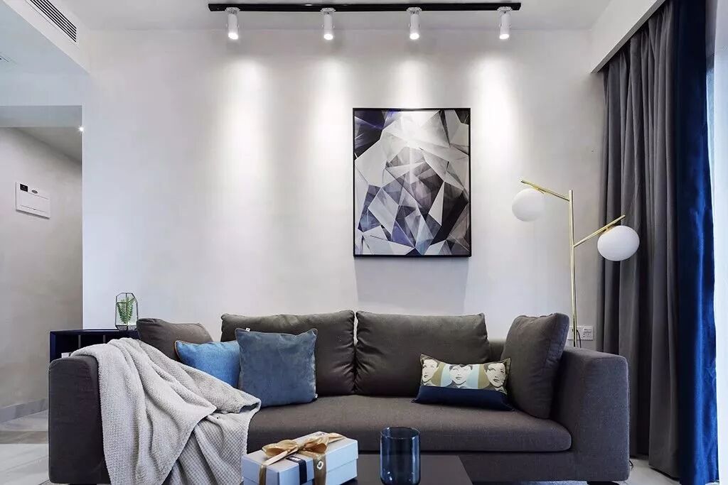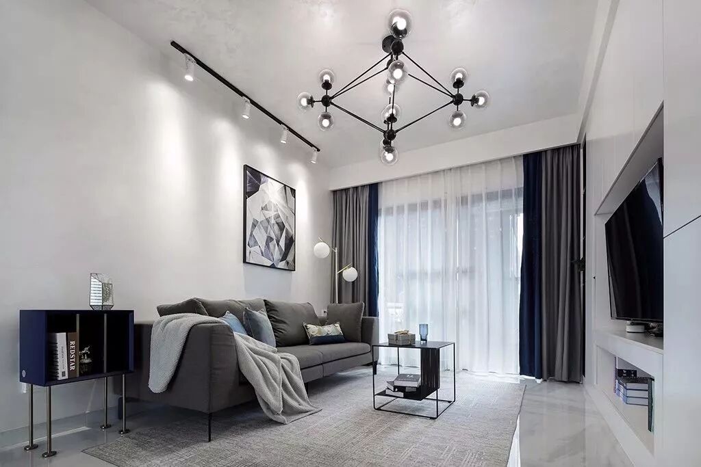 ▲灰色调的现代风格客厅,灰色地砖与地毯,搭配浅灰色布艺沙发,整体空间氛围显得简约而素雅,沙发墙上方的导轨灯,搭配中间一组球形的组合吊灯,整个空间都充满了现代舒适的大方氛围感。