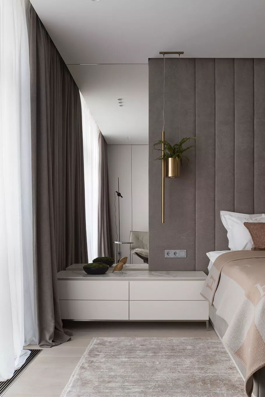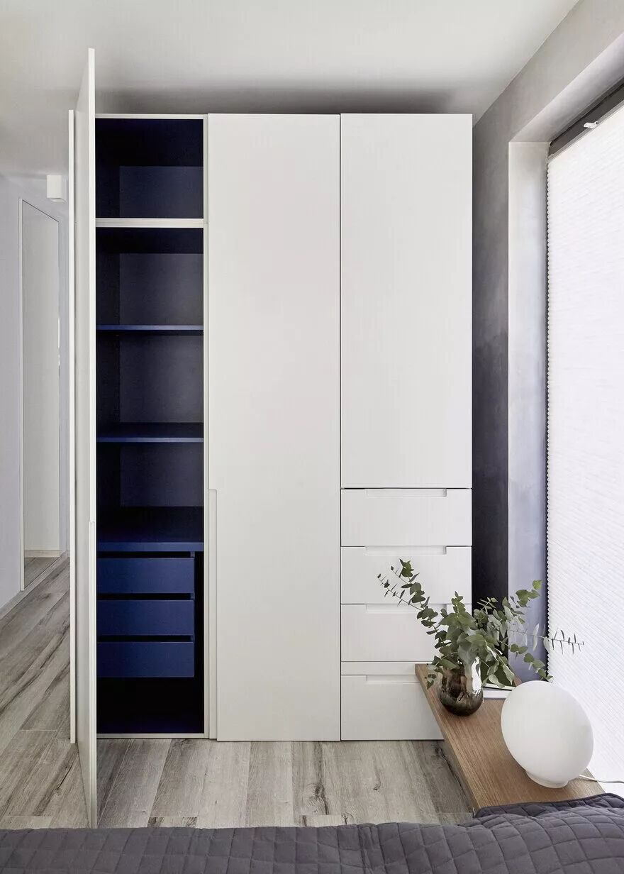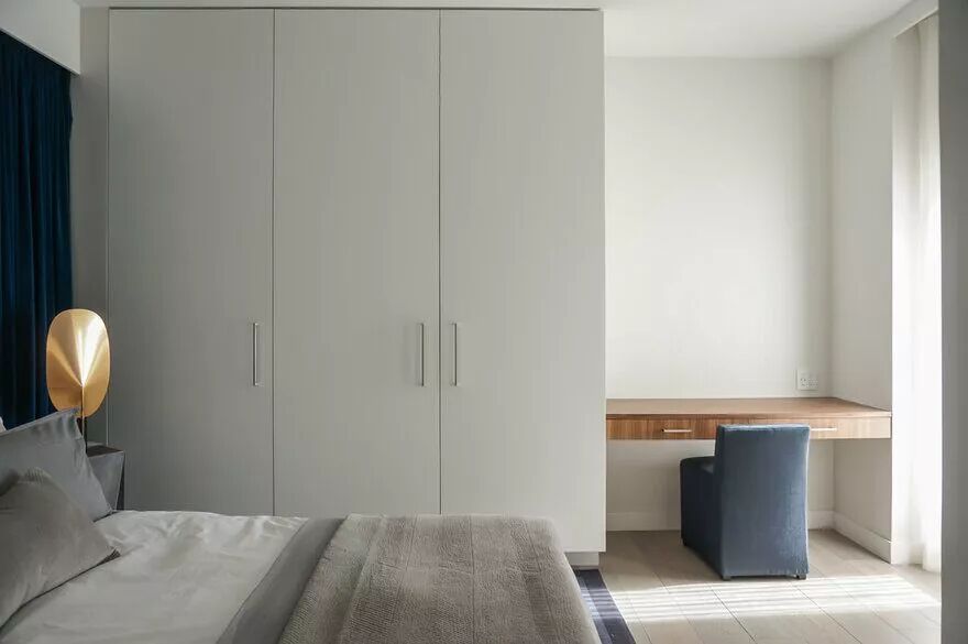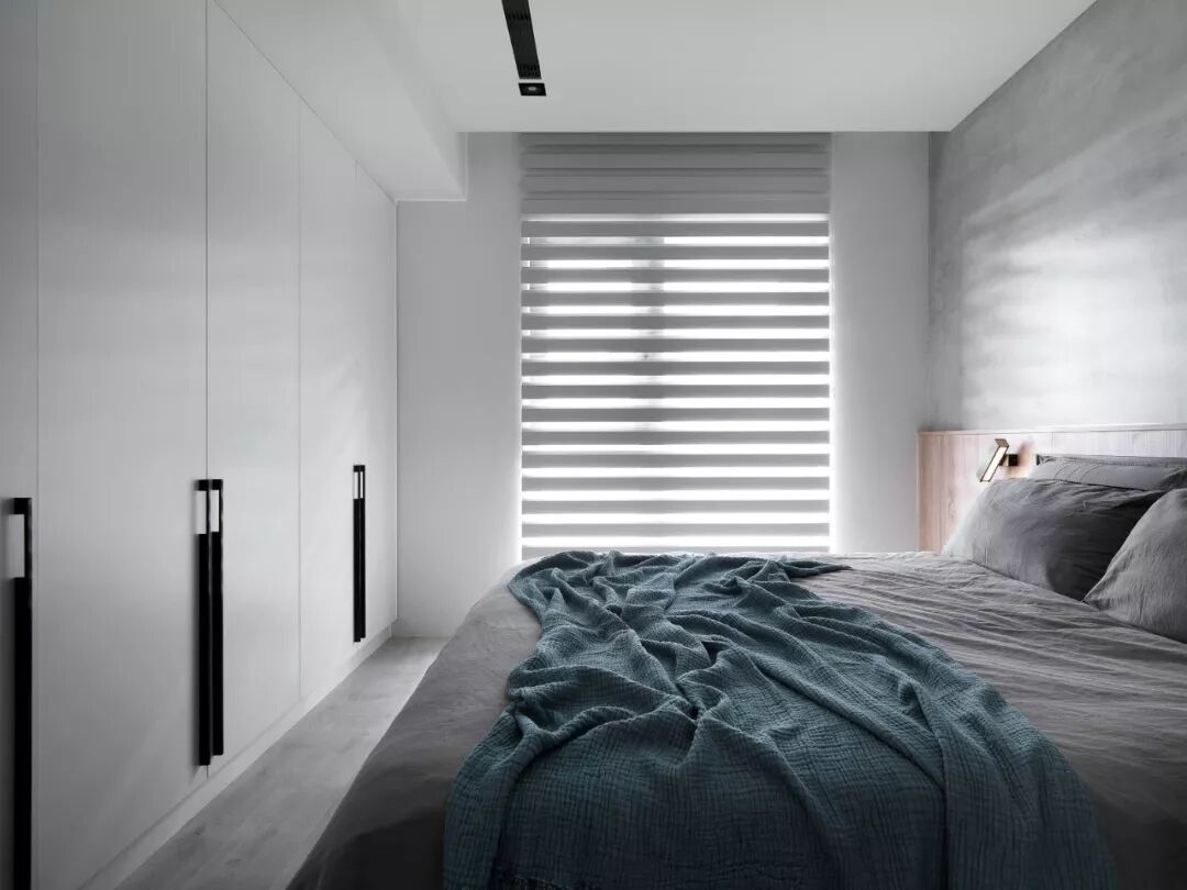 利用衣服使用视觉延伸法,也是拉升空间,使空间变大的手段之一。自上而下的衣柜占据一面墙的位置,拔高了整个卧室的视觉效果。