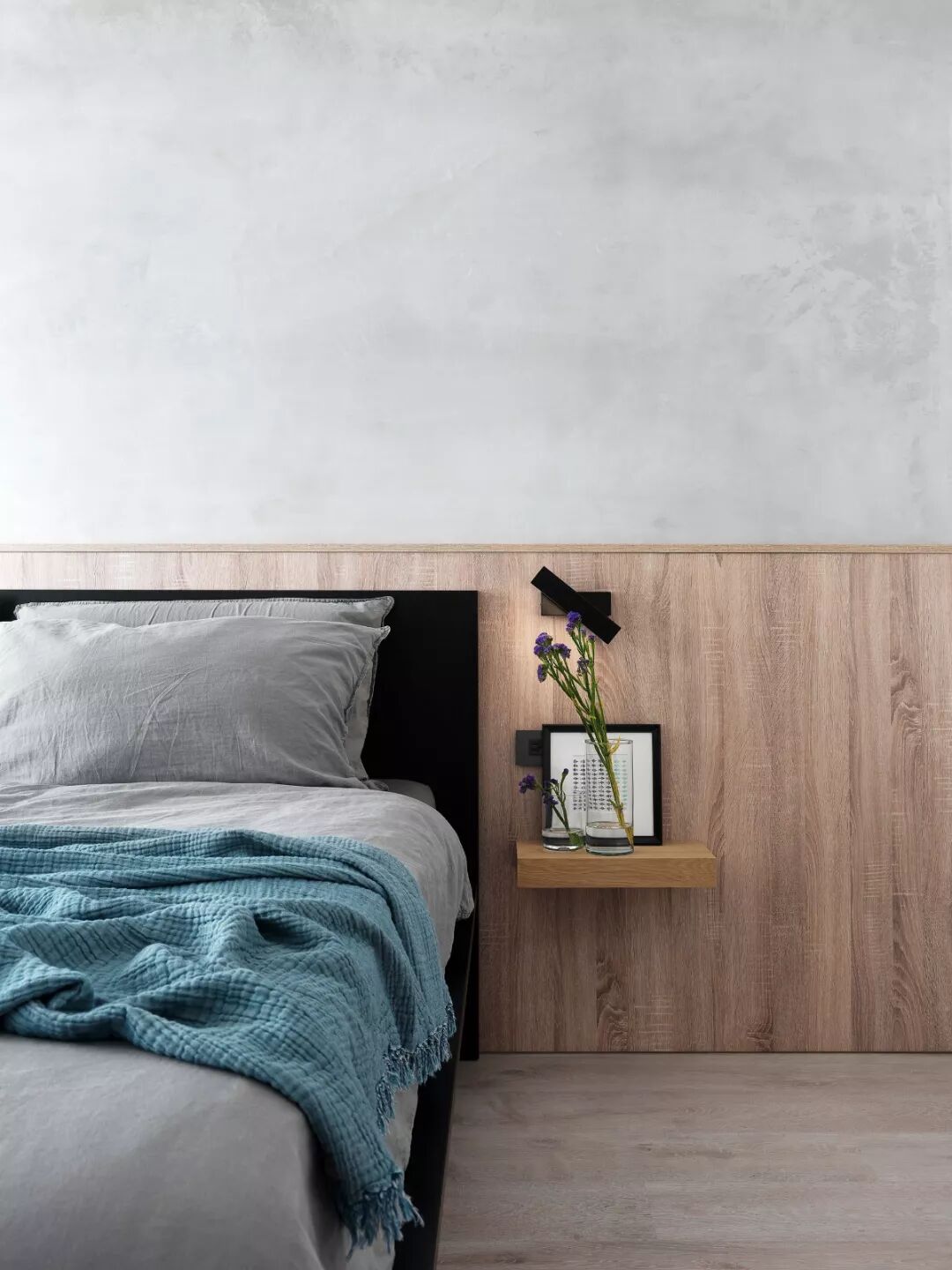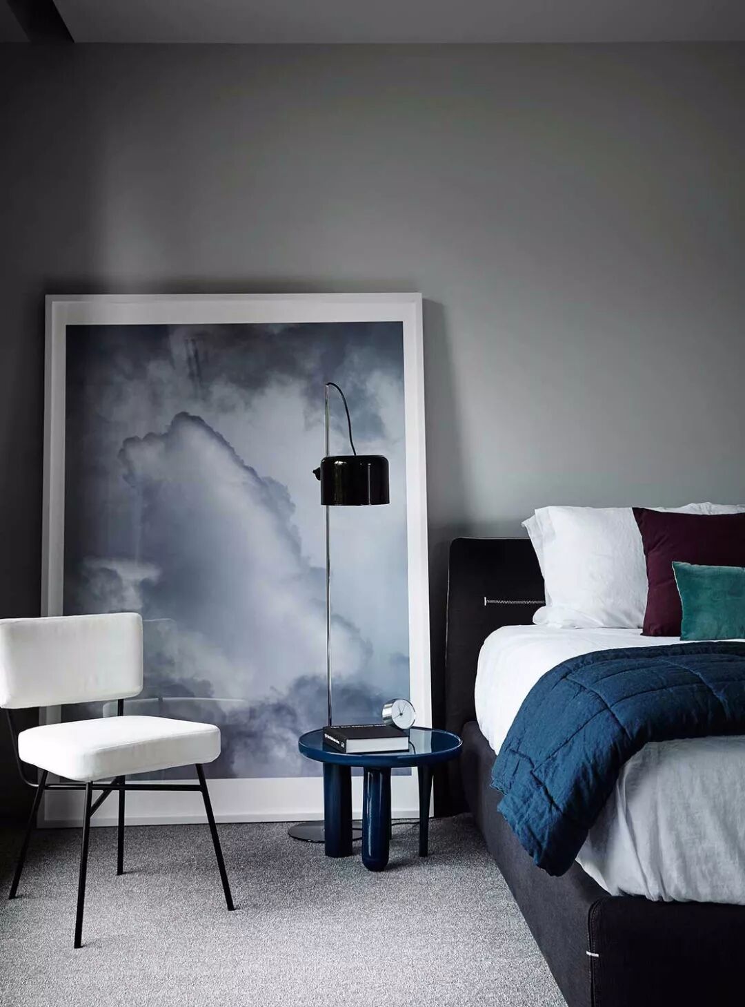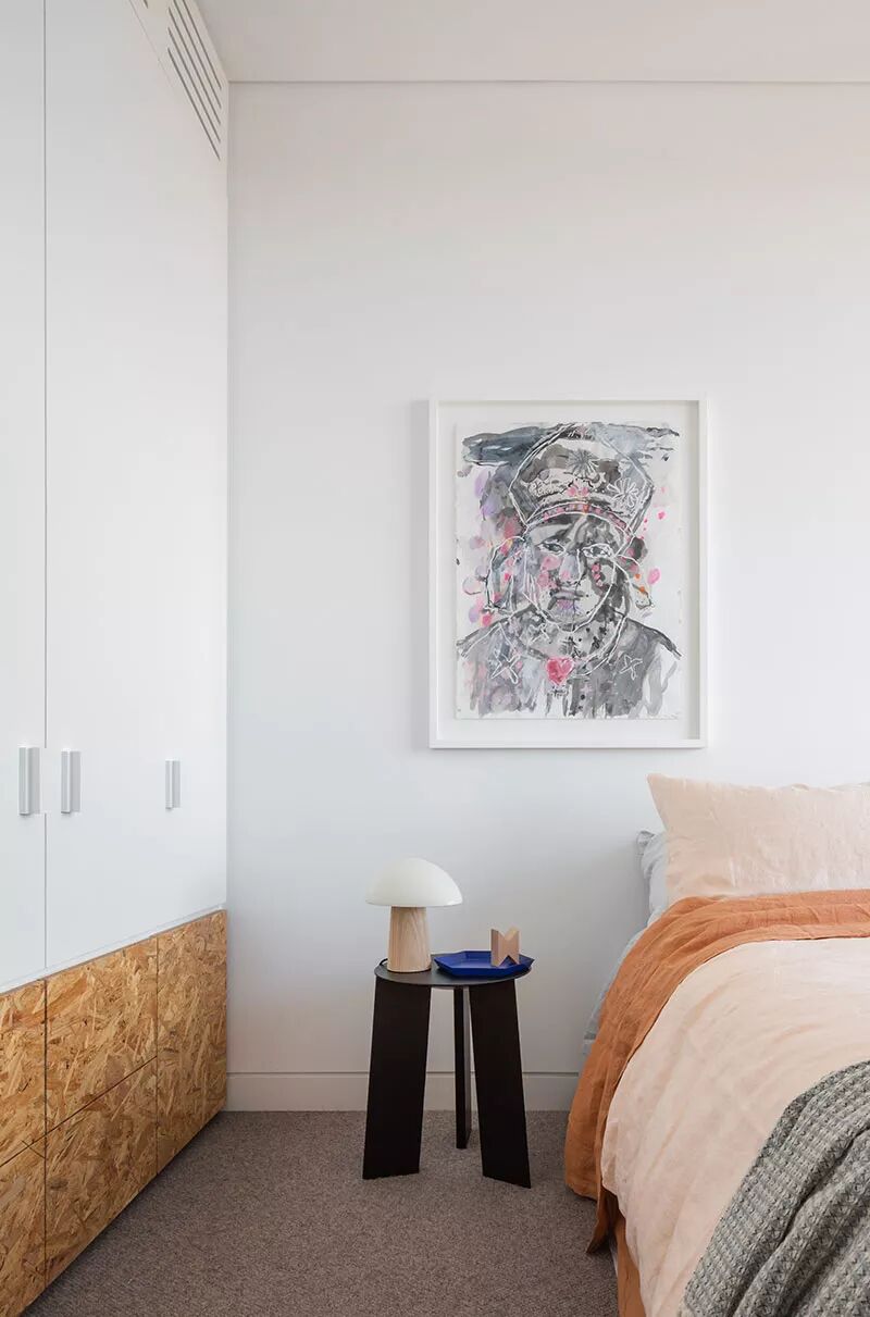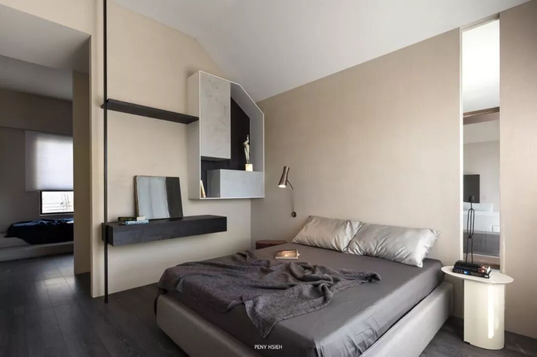 木质茶几、金属小桌,甚至墙壁上一块多出来的置物板,都能完美替代床头柜,看起来清爽又时尚。