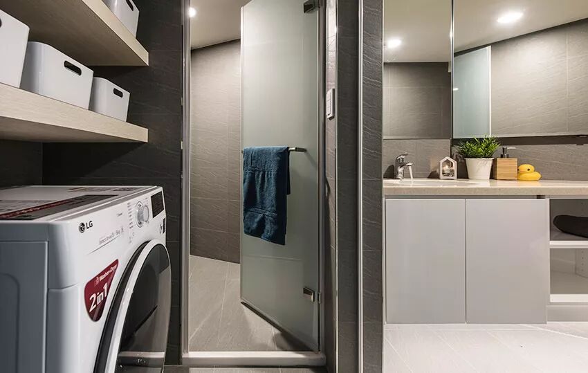 ▲洗衣区,不管是将洗衣机放在卫生间、厨房或者阳台,洗衣机的台面可以用来储物,并且上放空间放搁板是最机智的选择。