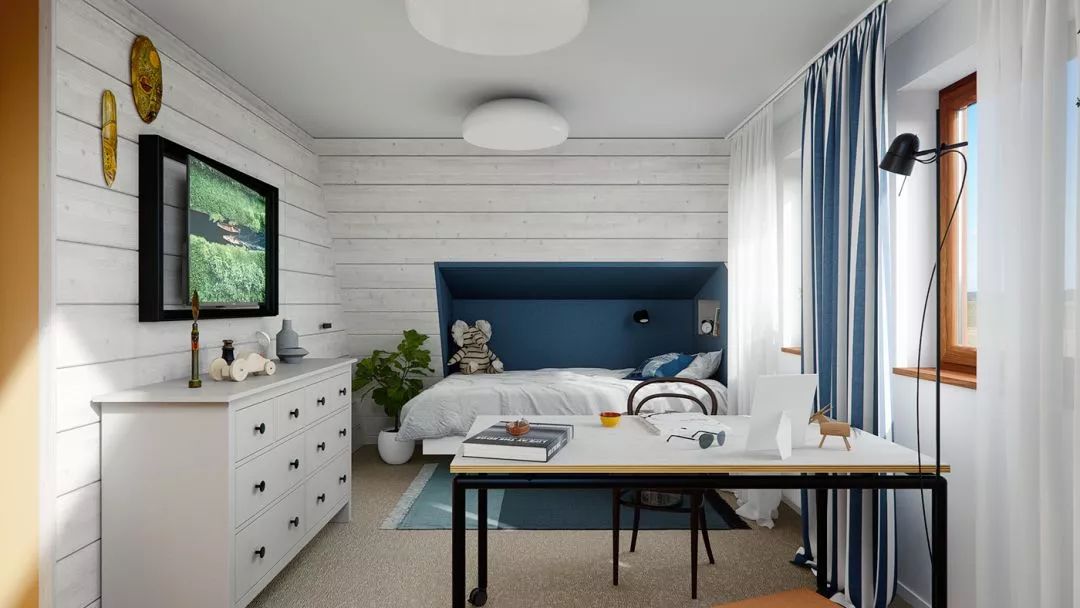 一般孩子的身材比较娇小,很适合阁楼这种低矮的结构。而且,不规则的造型与颇具趣味性的窗户设计,可以提升孩子的好奇心。