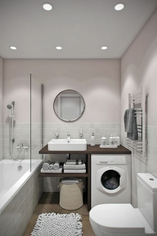 洗漱台下预留洗衣机的位置,不仅节约空间,也让卫生间显得非常整齐。洗衣机在洗漱台下,将水注入洗衣机中,也非常方便。