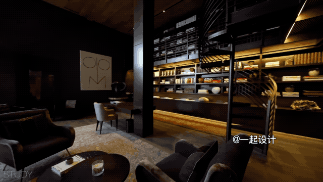 书房的布置更像一个有着LOFT感觉的小图书馆,内部有一个旋转楼梯通往两层高的书架处▽