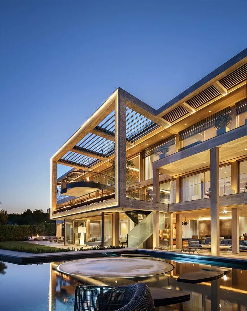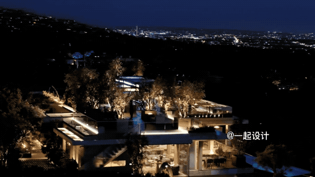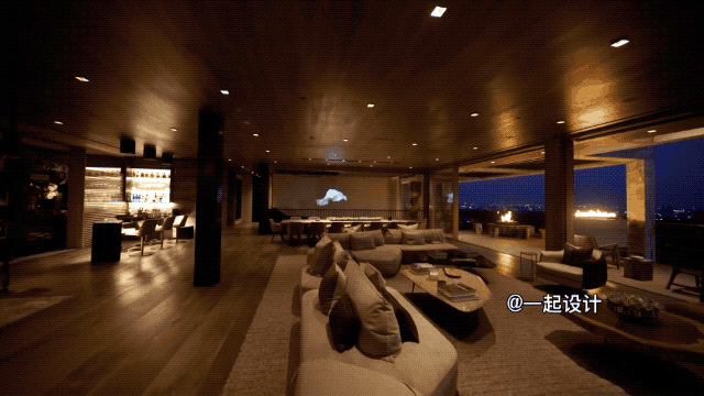 户外的灯光和火把整个建筑渲染的格外明亮,倒映在泳池的水面上,真实浮现了一座奢宅▽
