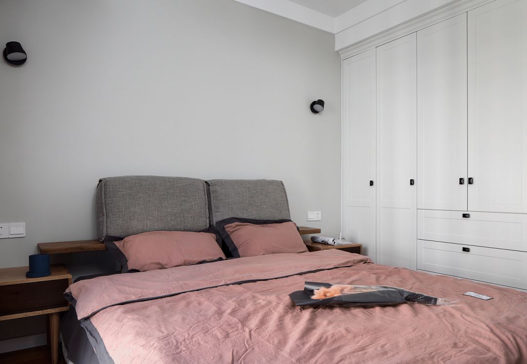 ▲卧室床头墙在留白的两侧挂了极简的壁灯,木质床搭配灰色与粉色的床单抱枕,简洁现代的衣柜搭配,整体显得素雅而又舒适大气。