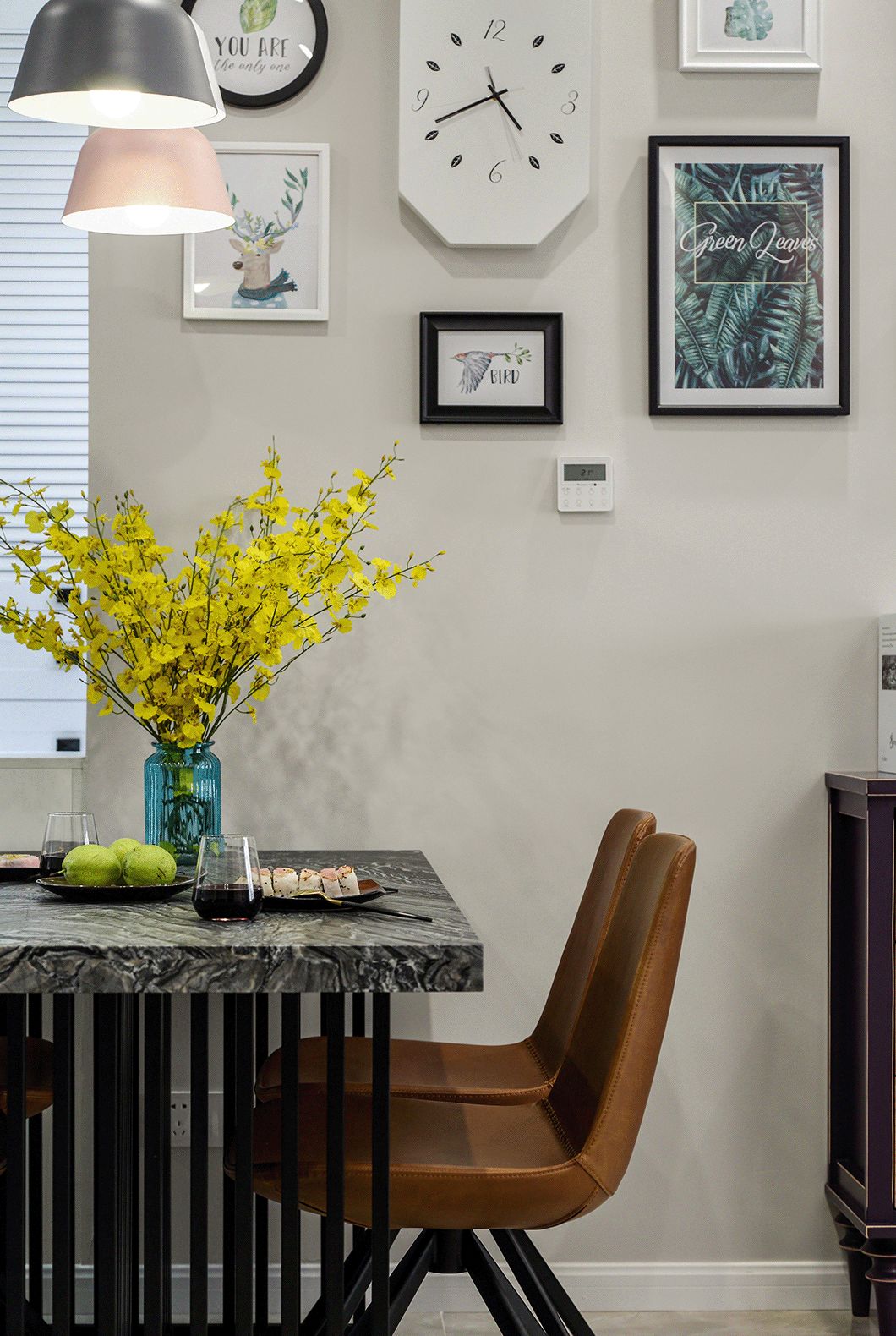 ▲餐厅以铁艺脚的餐桌椅,大理石台面与皮质座椅,顶上三盏灰白粉的吊灯,营造出现代优雅的浪漫氛围感。