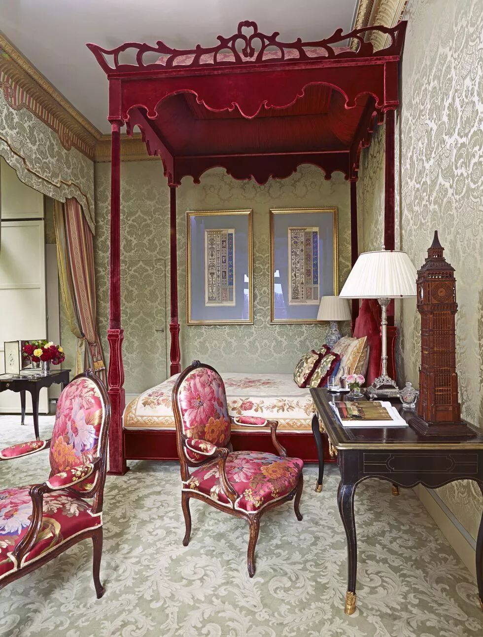 设计师Juan Pablo Molyneux位于巴黎南部,恢复了ChâteaudePouy-sur-Vannes庄严的宏伟建筑,每间客房都拥有古罗马雕塑和豪华面料。这间客房的墙壁采用La Manufacture Prelle丝绸锦缎包裹。Chippendale风格的天蓬床配有路易十五椅子和摄政台。