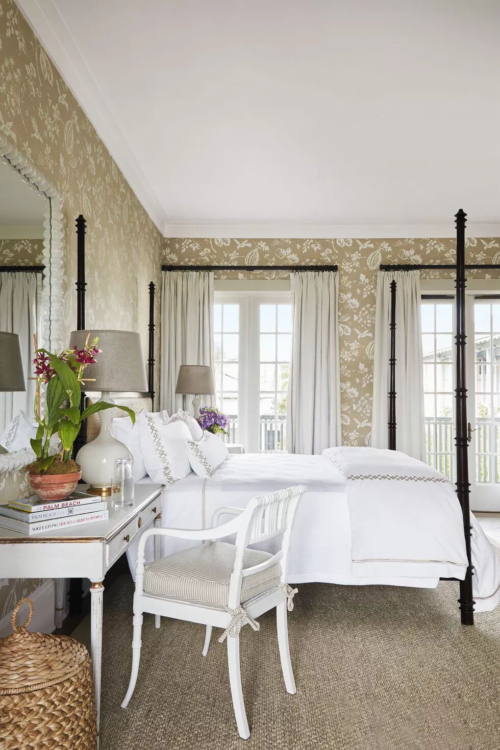 设计师亚历山德拉·布兰卡(Alessandra Branca)以华丽的Brunschwig&Fils棉布覆盖墙壁,这间佛罗里达州卧室充满着海滩和休闲格调。老式椅子的垫子采用Dedar面料制成。
