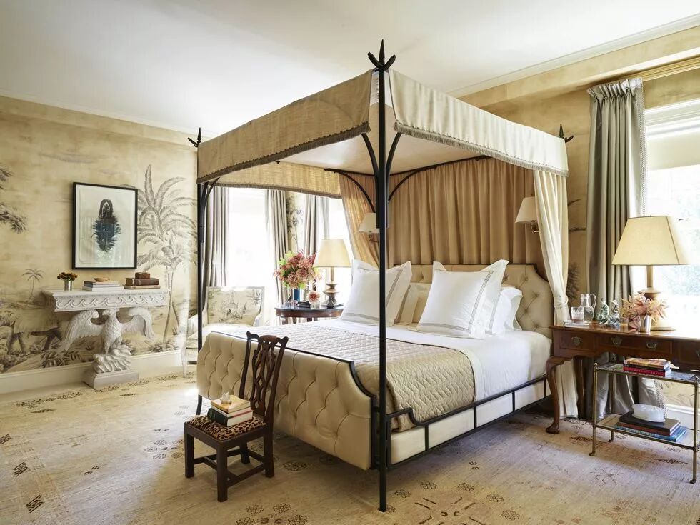 设计师Betsy Shiverick在她的Palm Beach主卧室配有丰富的色彩和优雅俏皮的图案。墙壁被de Gournay包围在墙纸中。漂亮的沙发是复古的,而床是定制的。