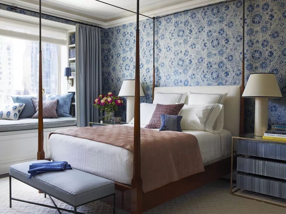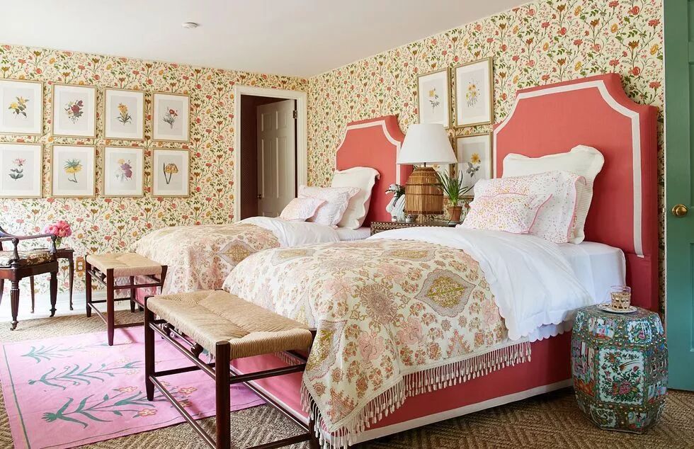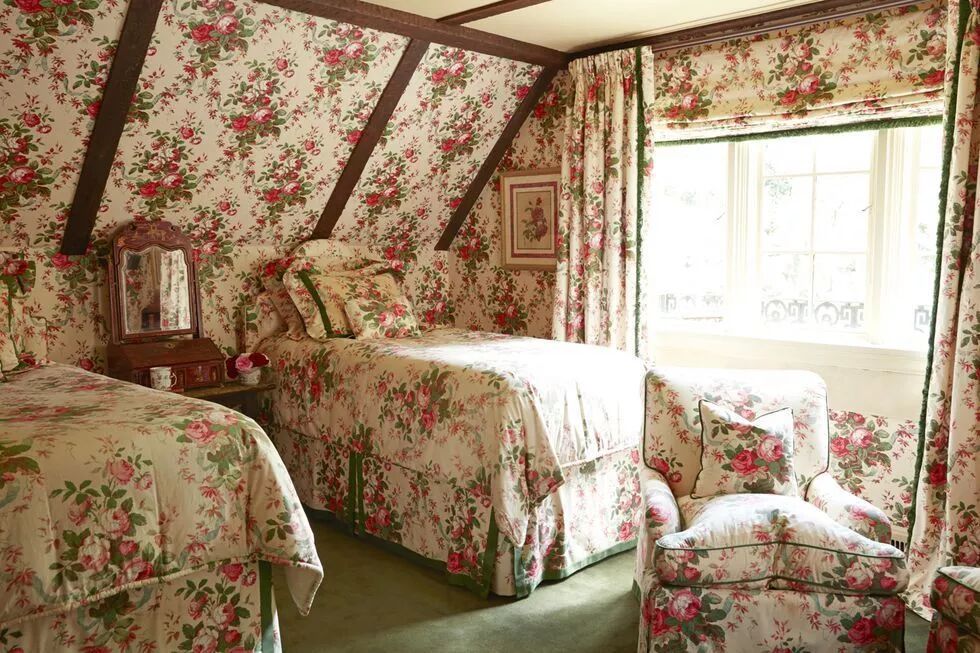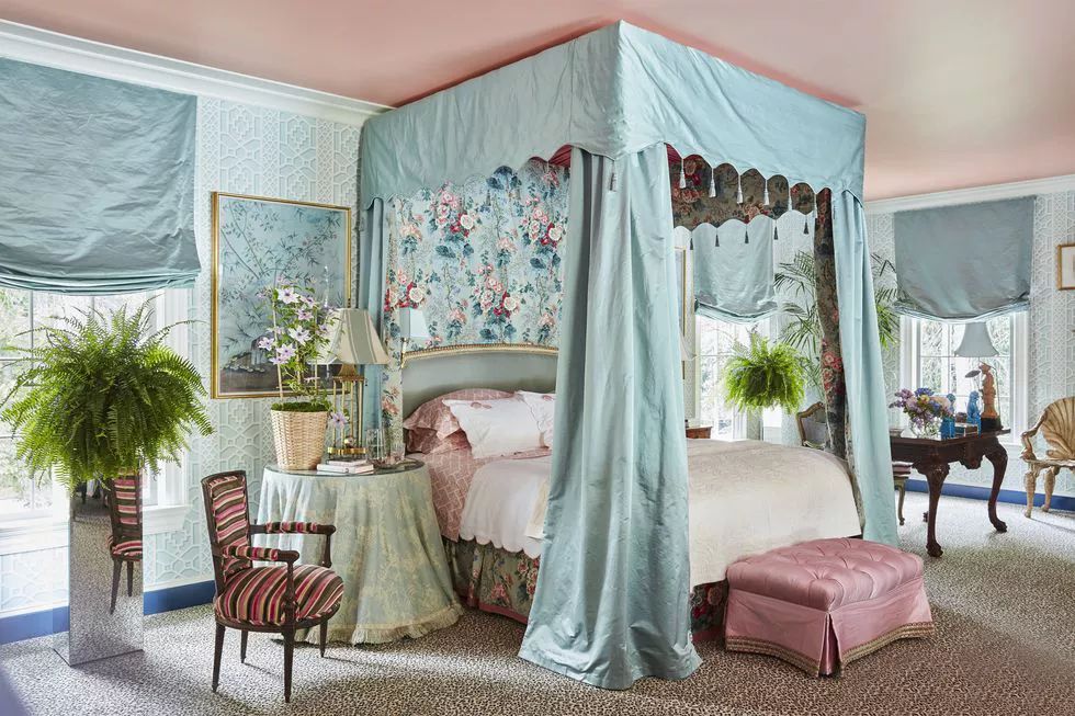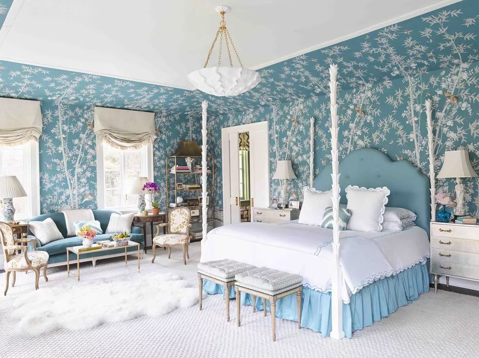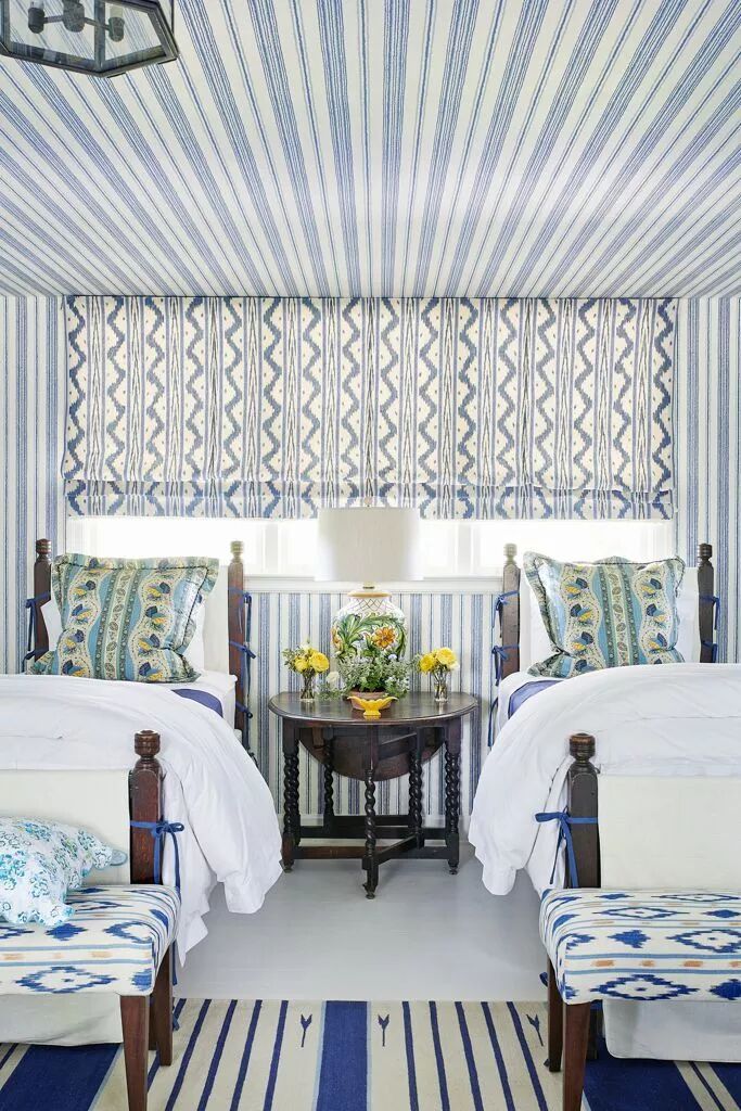 这是阿拉巴马州牧场的顶层客房,采用Sister Parish覆盖墙面。设计师Mark D. Sikes使用Jasper帷幔和长凳面料来搭配蓝白图案的墙壁。