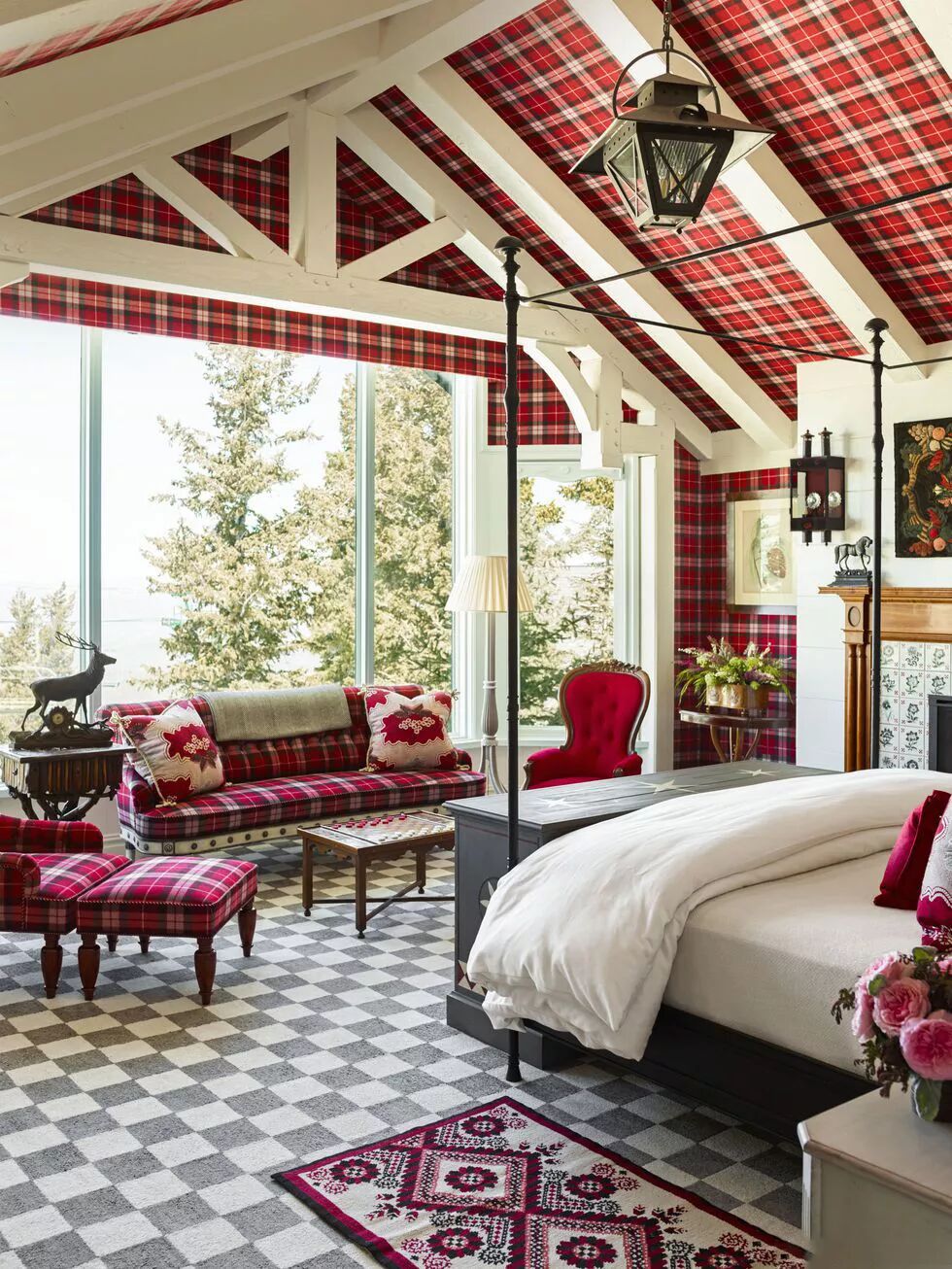 犹他山区卧室的墙壁和凸起的天花板上采用定制编织格子使通风空间感觉更舒适。设计师安东尼·巴拉塔(Anthony Baratta)使用了充满红色色调的温暖色调。古色古香的维多利亚式椅子采用Holland&Sherry面料制成。